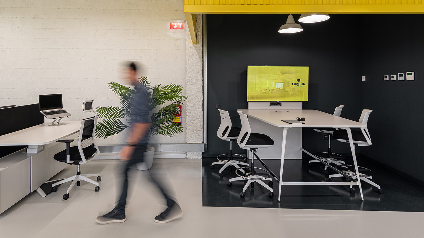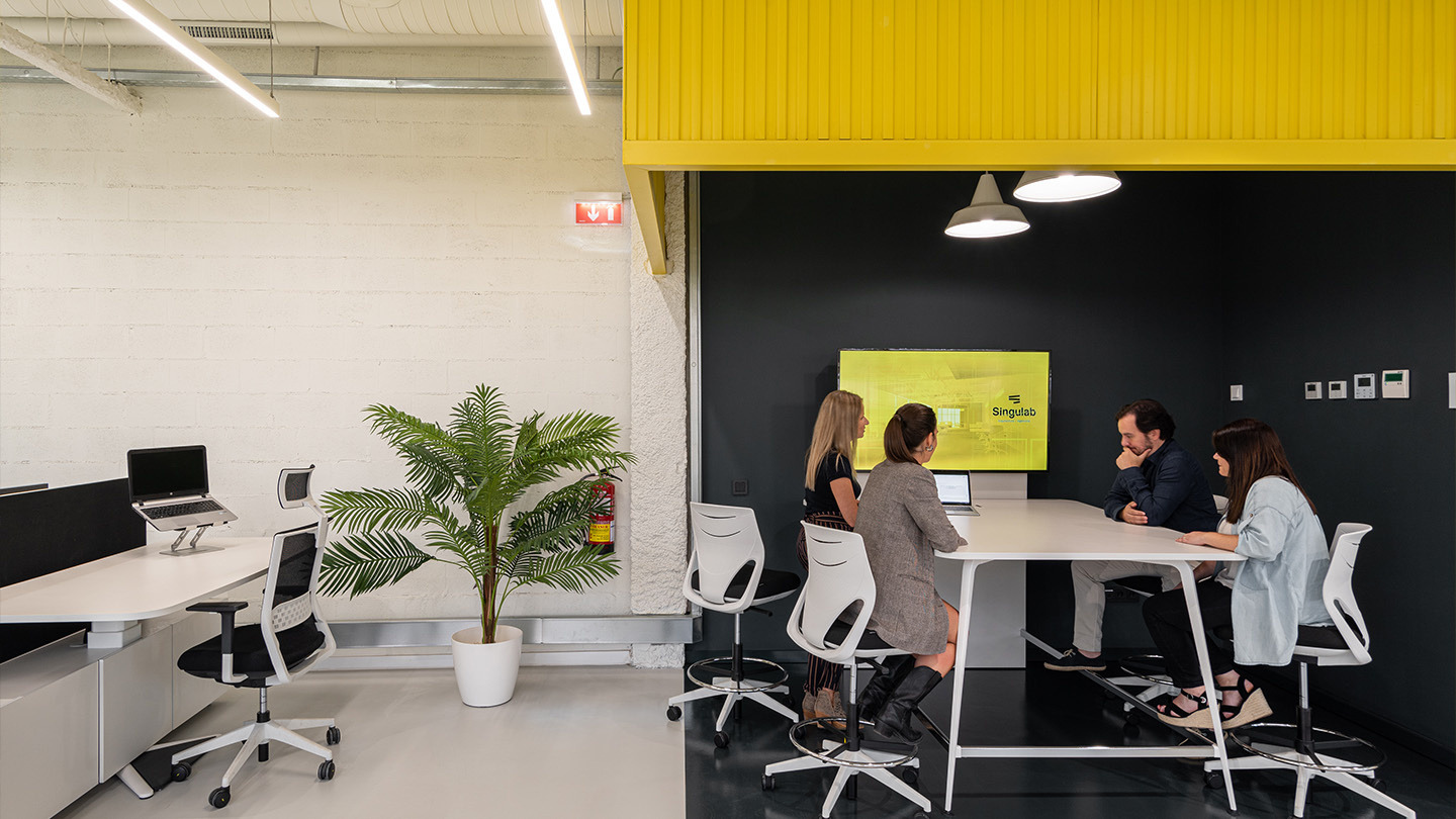 Distribuida en dos plantas, la nueva sede da respuesta a un programa de necesidades que Singulab ya venía 'estudiando' desde su antigua localización, donde zonas abiertas conviven con salas más 'acotadas', para reuniones y despachos, y áreas intermedias de intercambio o formación. Un gran espacio de trabajo fluido y dinámico, lleno de colores y texturas, y donde la estructura e instalaciones originales conviven con volúmenes exentos, planos acristalados, chapas metálicas teñidas de amarillo y una barandilla convertida en tabique.