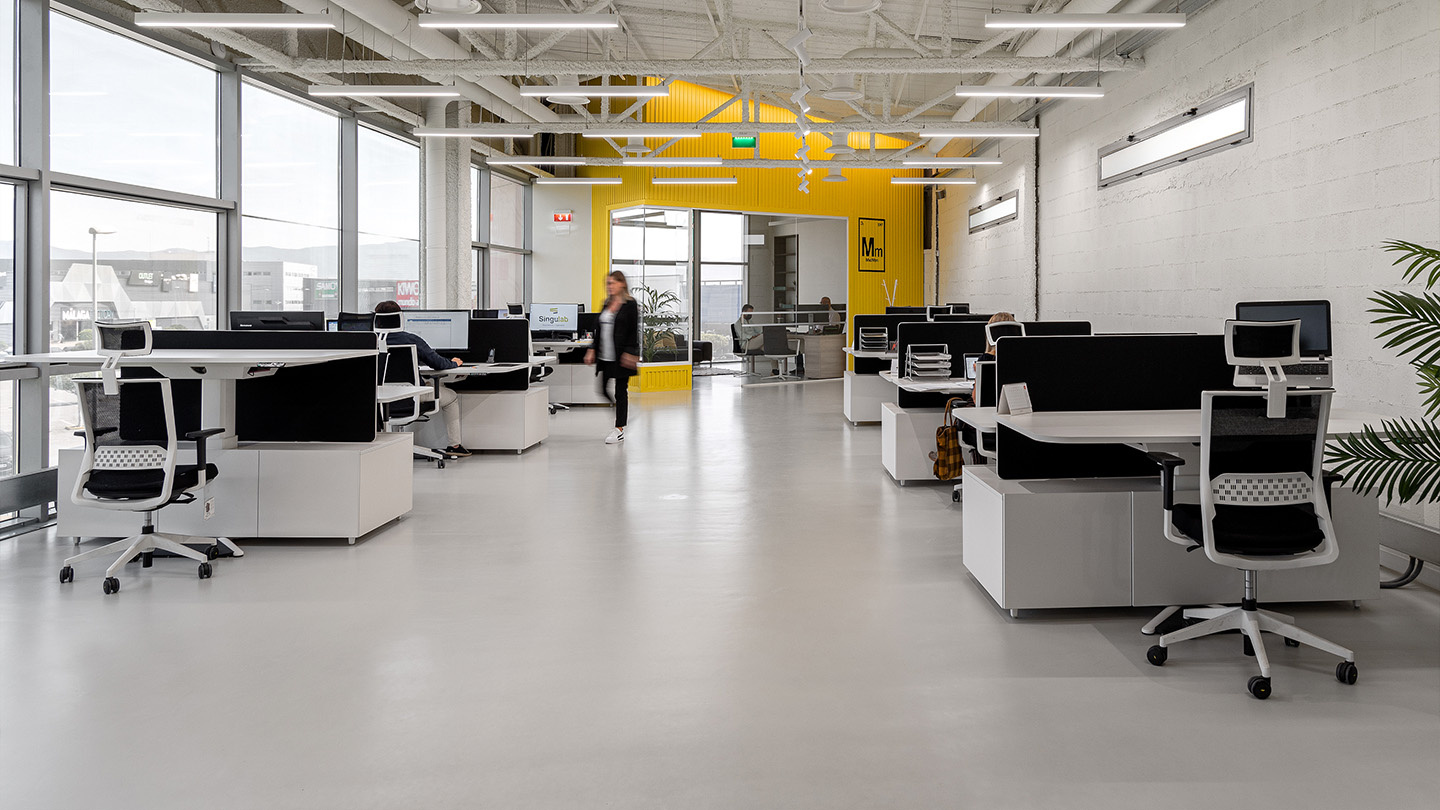 Reformar su nuevo espacio de trabajo, situado junto a uno de los accesos oeste principales de la ciudad y que había permanecido en bruto desde su construcción, ha sido el reto al que el estudio de arquitectura e ingeniería con sede en Málaga, Singulab, se ha enfrentado en este proyecto. Un local prácticamente abandonado, pero con infinitas posibilidades y una fuerte personalidad, gracias a la abundante luz natural que atraviesa el muro cortina de su fachada y una gran altura libre.