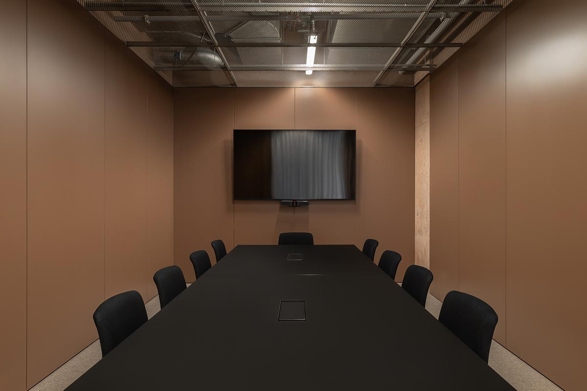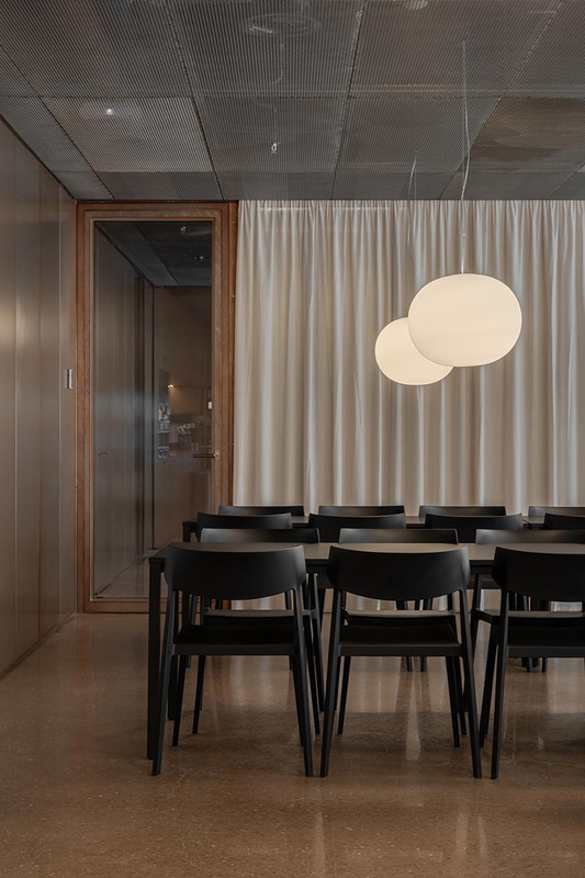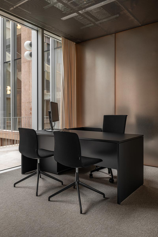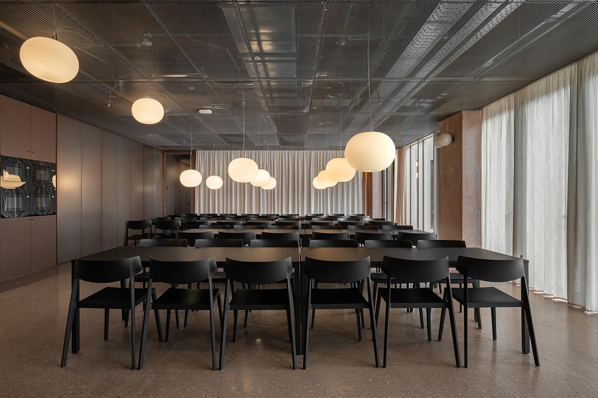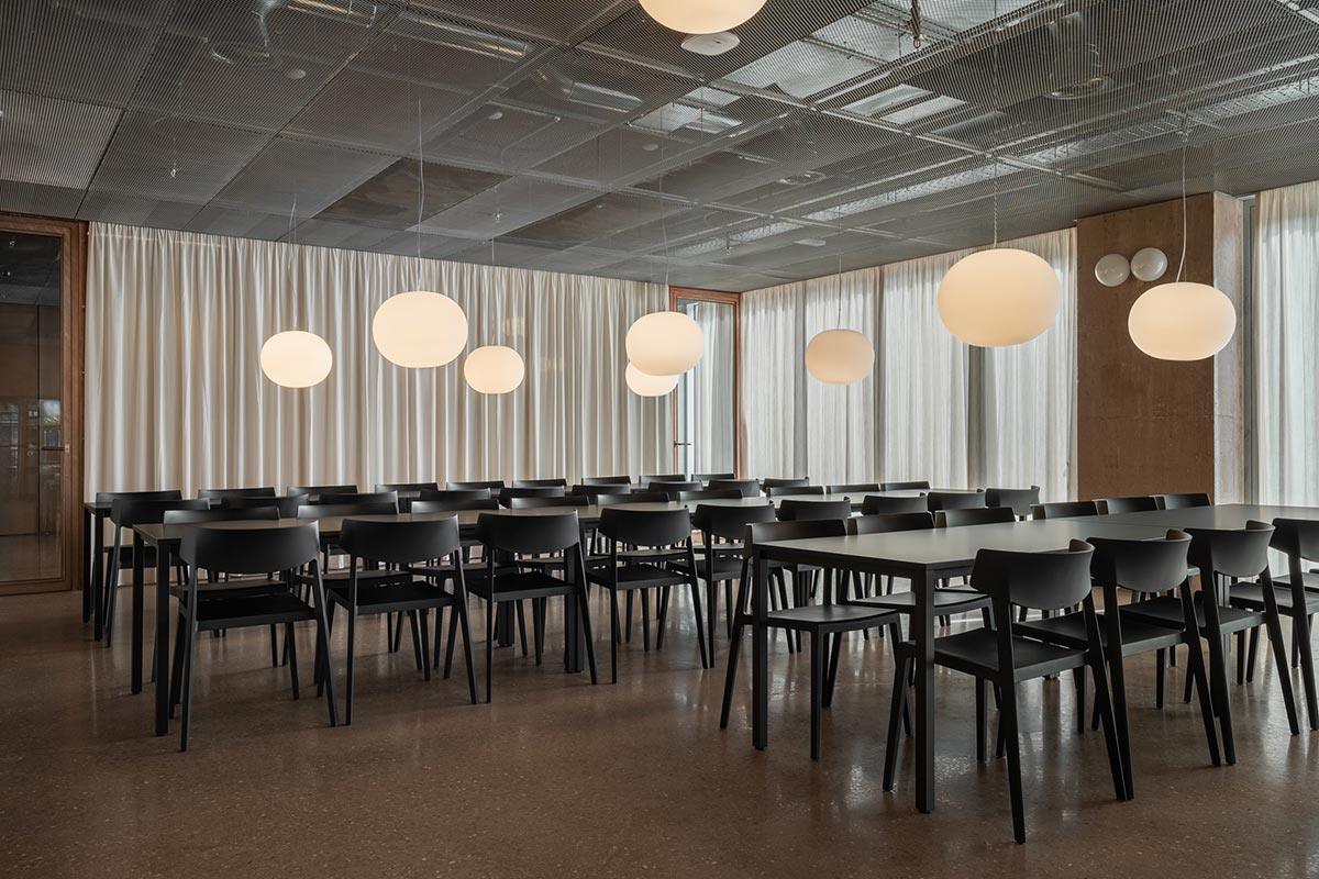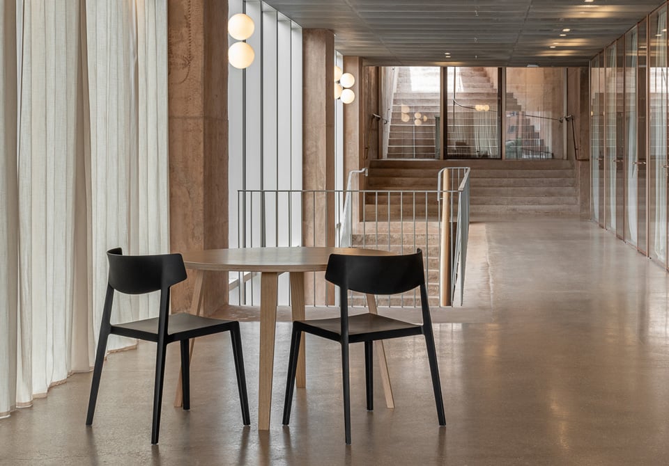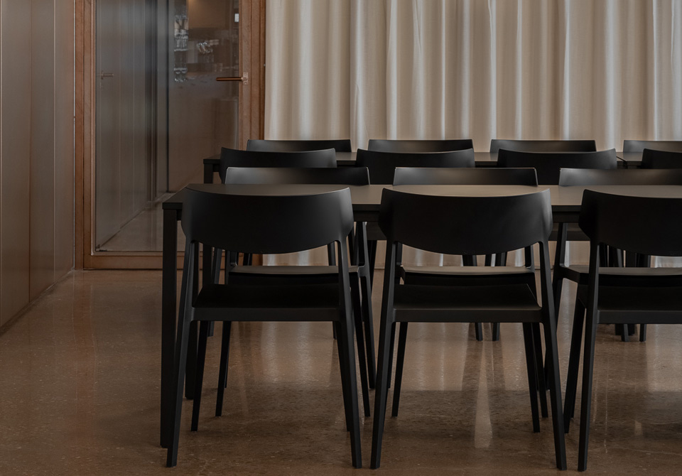 Incluso las mesas operativas Prisma, que no existían en acabado negro, incorporan una nueva versión en este color que se añade al catálogo. Para permitir diferentes usos y configuraciones, en la sala de reunión más grande se ha elegido la mesa polivalente con ruedas del modelo Trama, electrificada para permitir el uso de ordenadores durante las reuniones. Las sillas Stay, Wing y Noom, y las mesas Tabula, son otros de los programas utilizados.