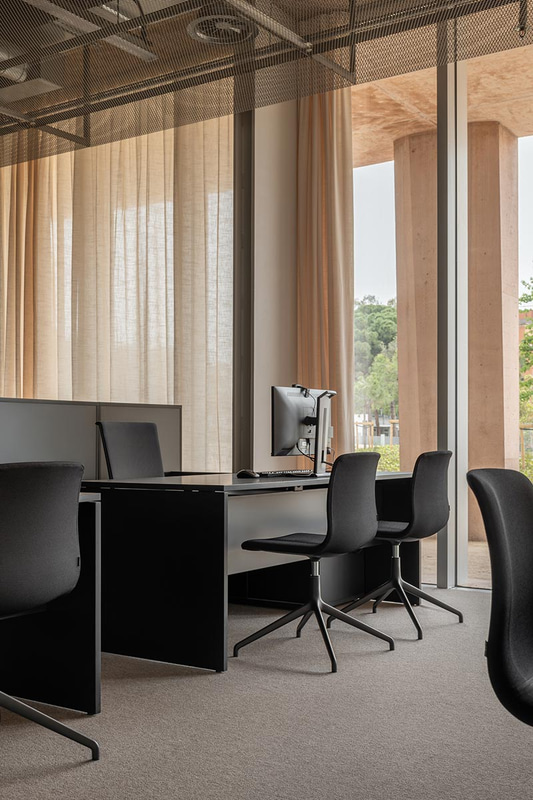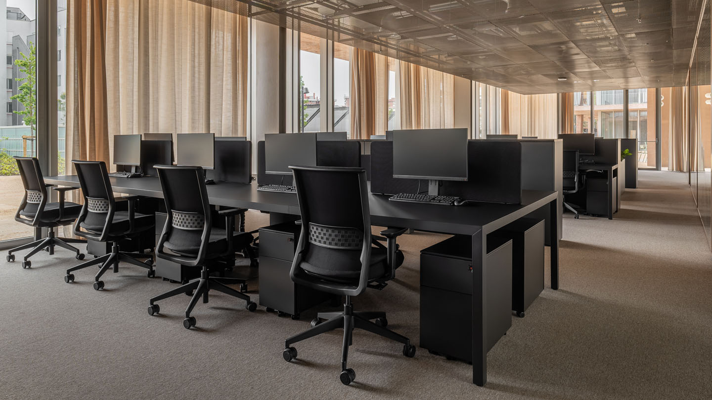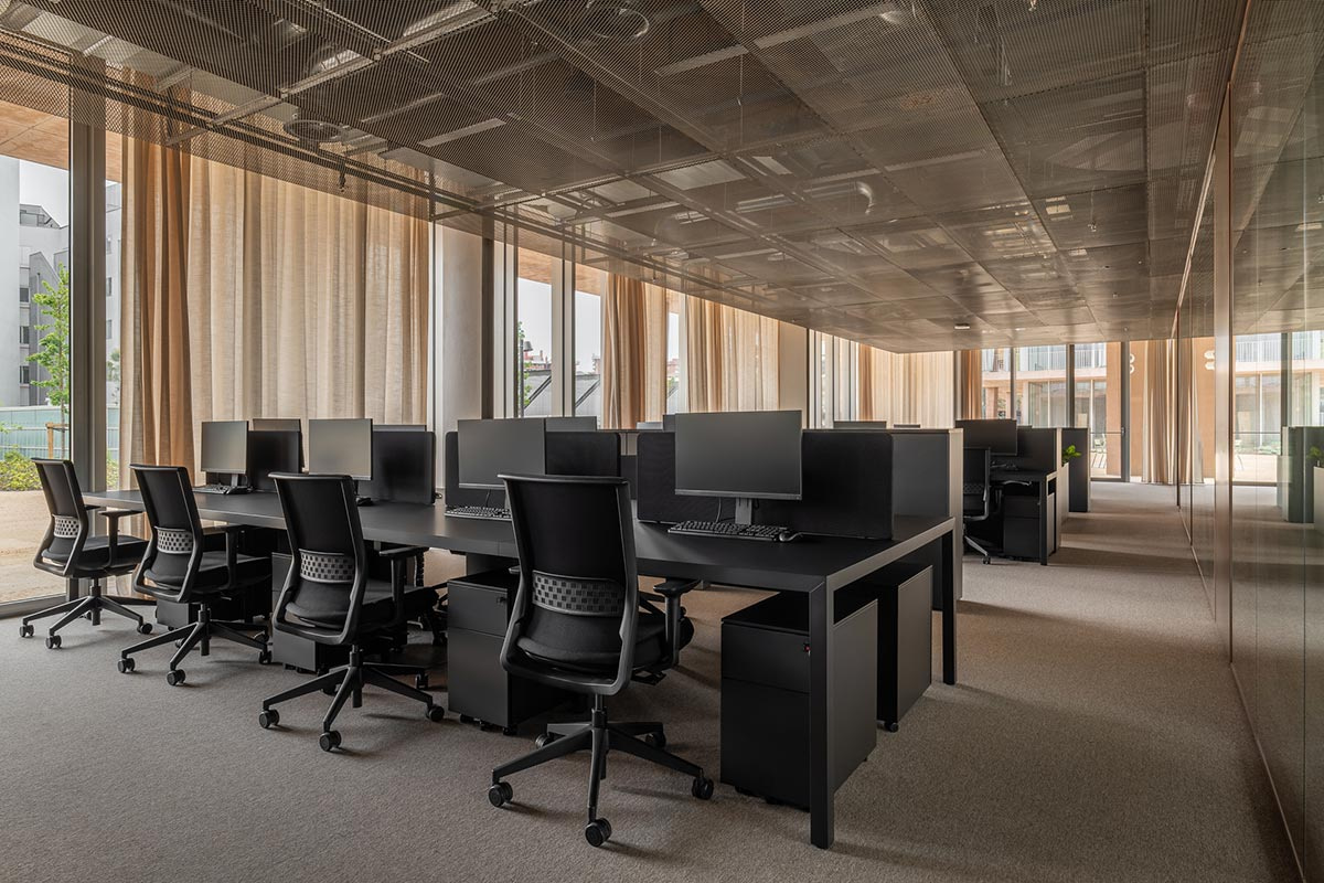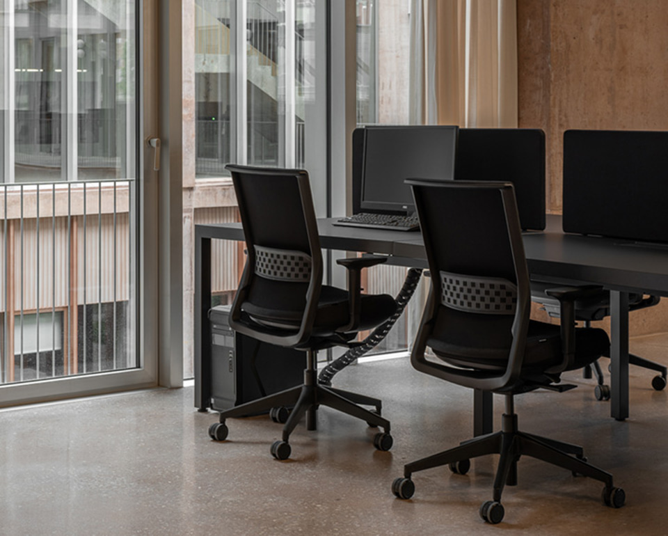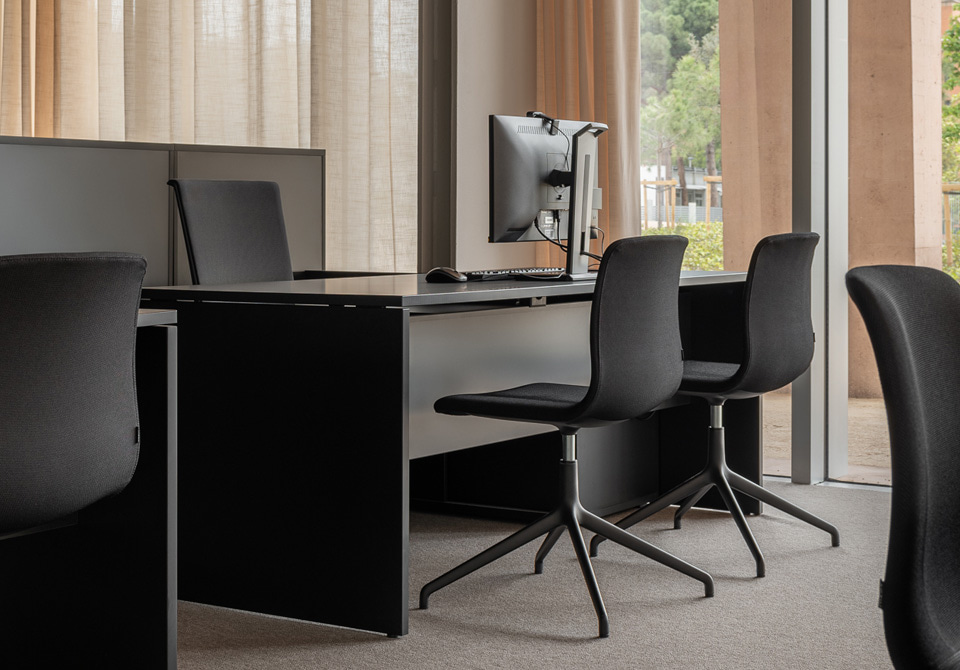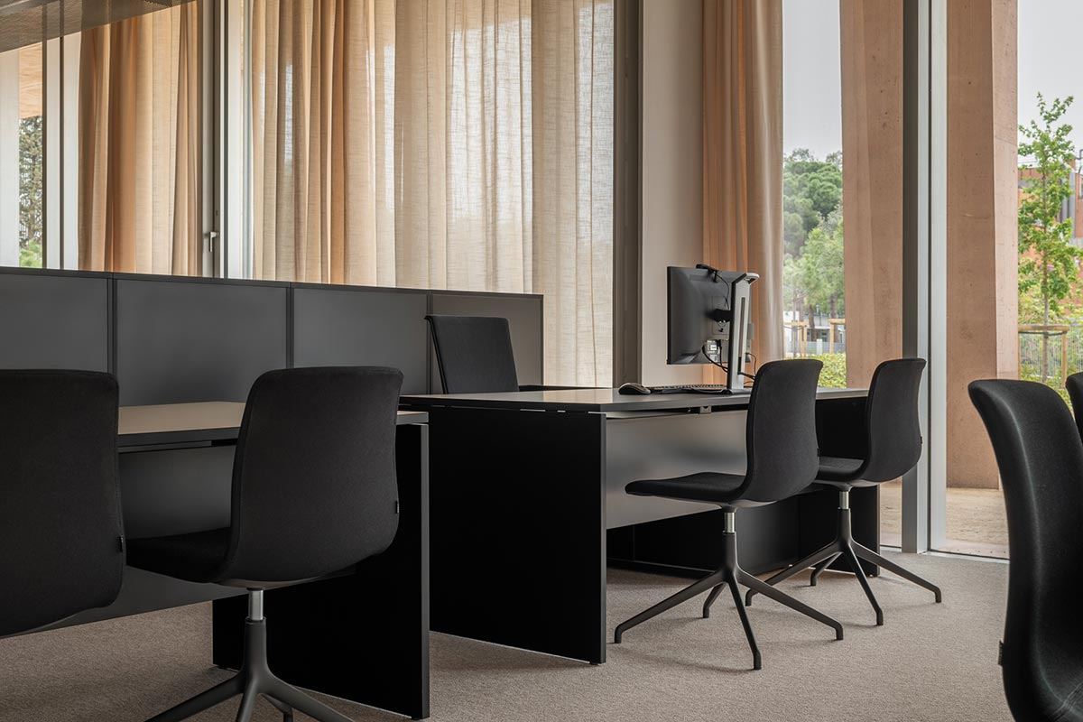 Integrado en la arquitectura, en un color negro que contrasta con el mobiliario blanco de las zonas de laboratorio, y con una tapicería lo más sostenible posible, en fibra reciclada, el mobiliario de Actiu elegido para los espacios de oficina cumple con todos los requisitos técnicos necesarios para equipar un lugar de trabajo público, y cuenta con la máxima certificación de producto, ergonomía y sostenibilidad.