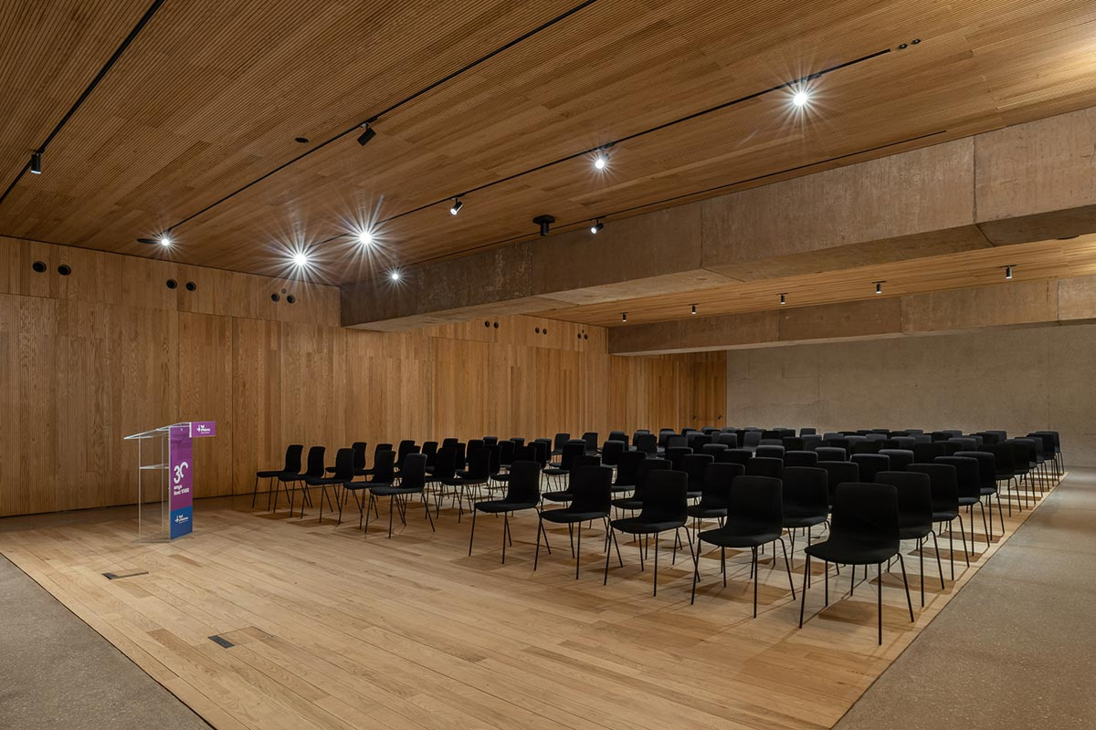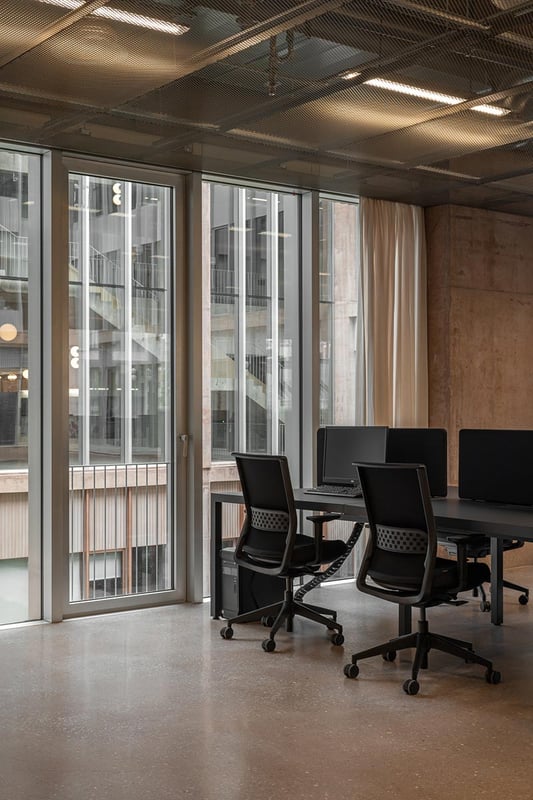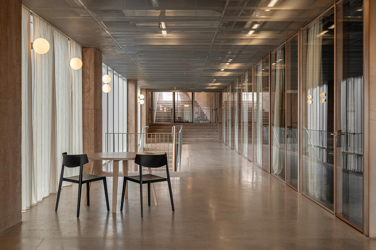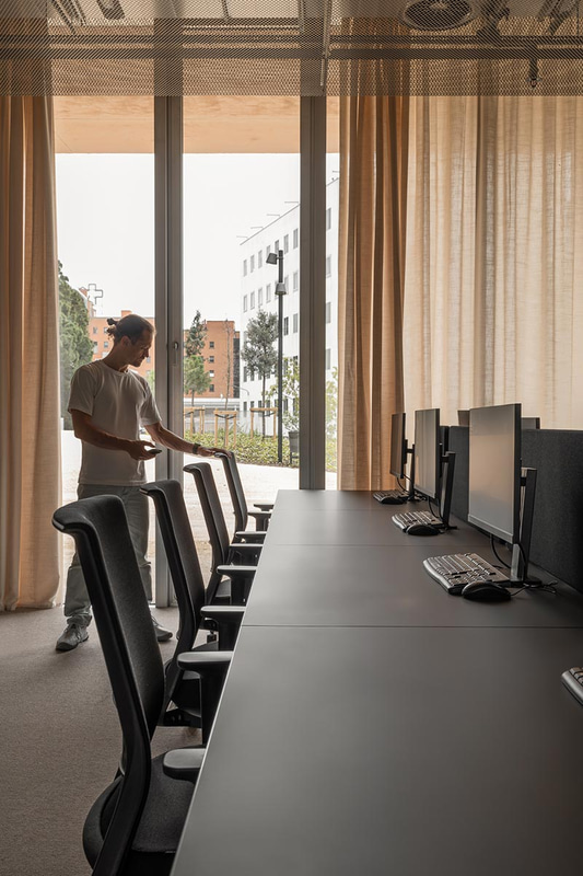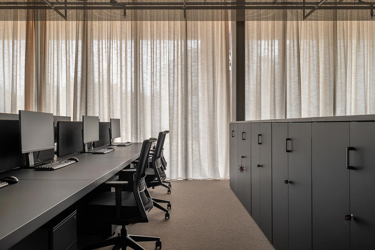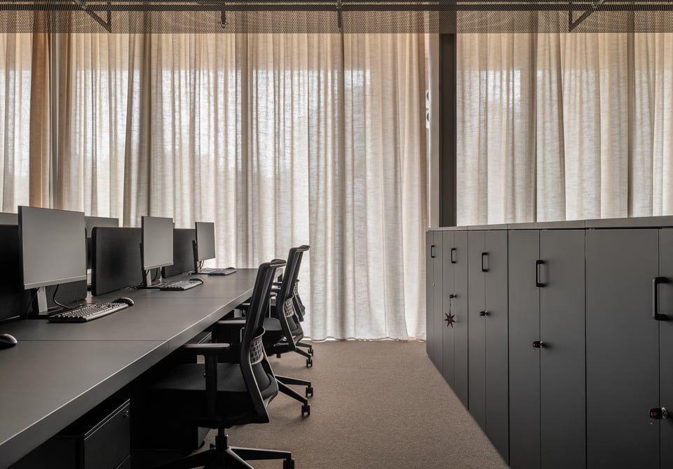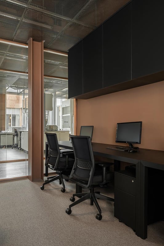 Integrado en la arquitectura, en un color negro que contrasta con el mobiliario blanco de las zonas de laboratorio, y con una tapicería lo más sostenible posible, en fibra reciclada, el mobiliario de Actiu elegido para los espacios de oficina cumple con todos los requisitos técnicos necesarios para equipar un lugar de trabajo público, y cuenta con la máxima certificación de producto, ergonomía y sostenibilidad.
