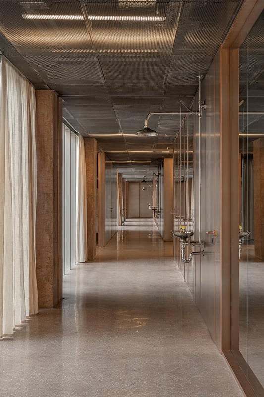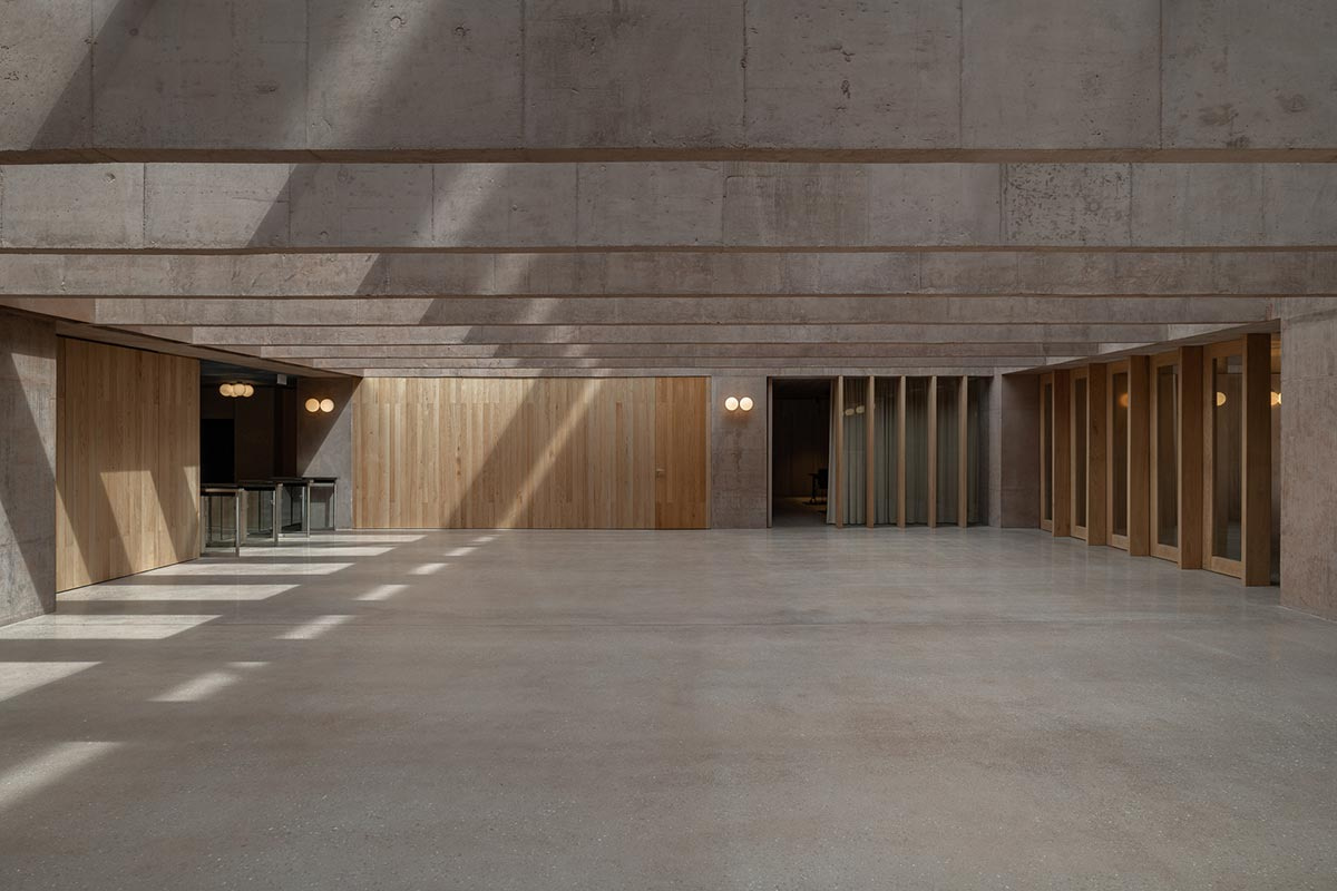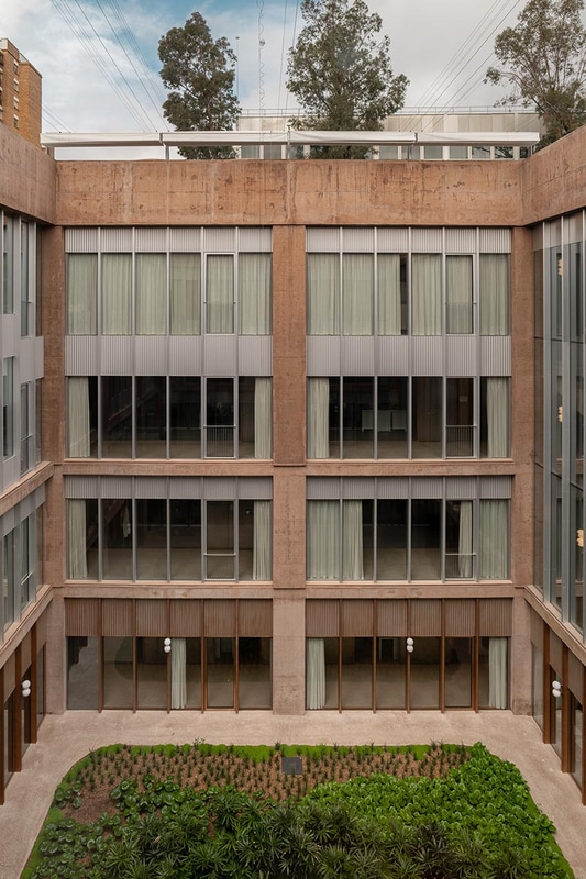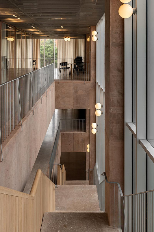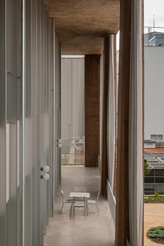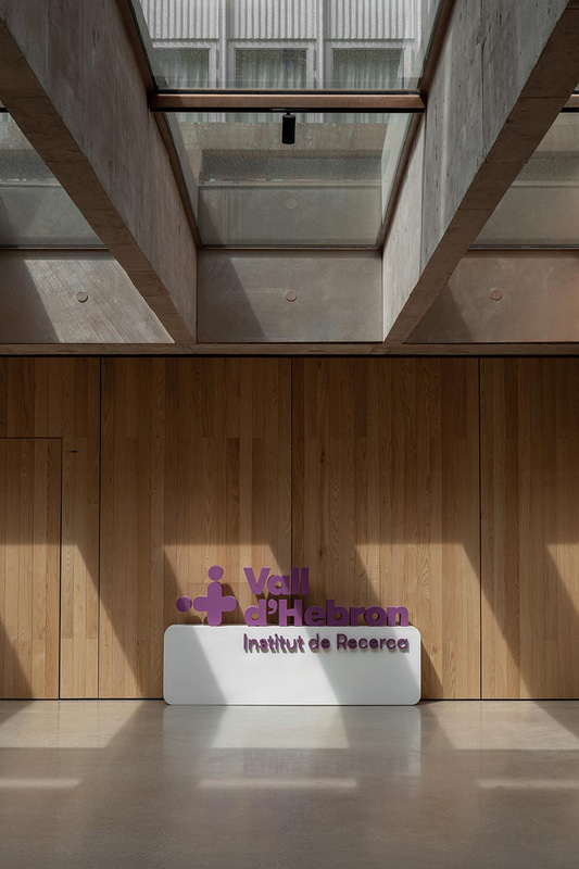 Con una planta definida por tres patios, en torno a los que se agrupan los laboratorios y se generan recorridos que alternan espacios exteriores e interiores, de ocio y encuentro, y terrazas recorriendo la fachada, el VHIR es un edificio empotrado en la montaña, con una sola fachada y que se convierte en una prolongación del paisaje de la montaña de Collserola.