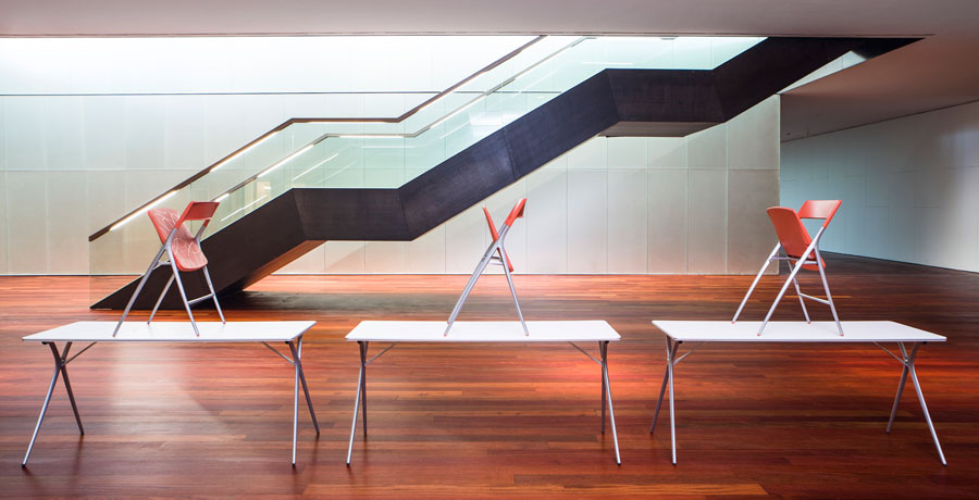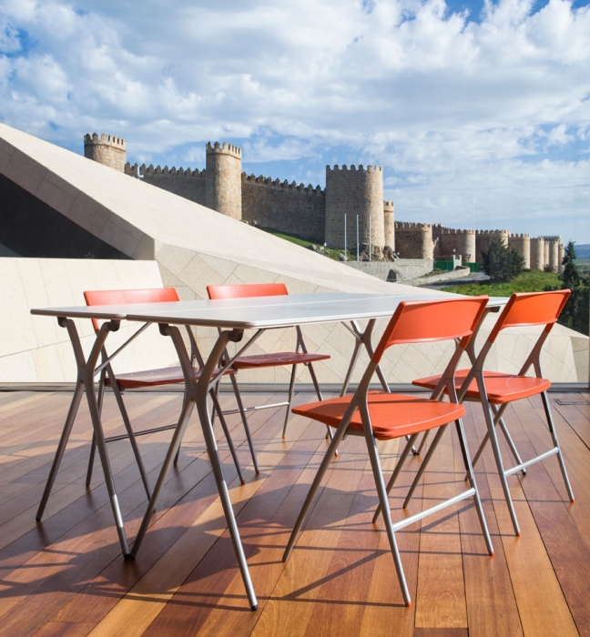 La combinación de mesas y sillas plegables permite crear configuraciones de altas prestaciones, dinámicas y estéticas, capaces de integrarse en espacios públicos o colectivos, así como para uso privado en el hogar.