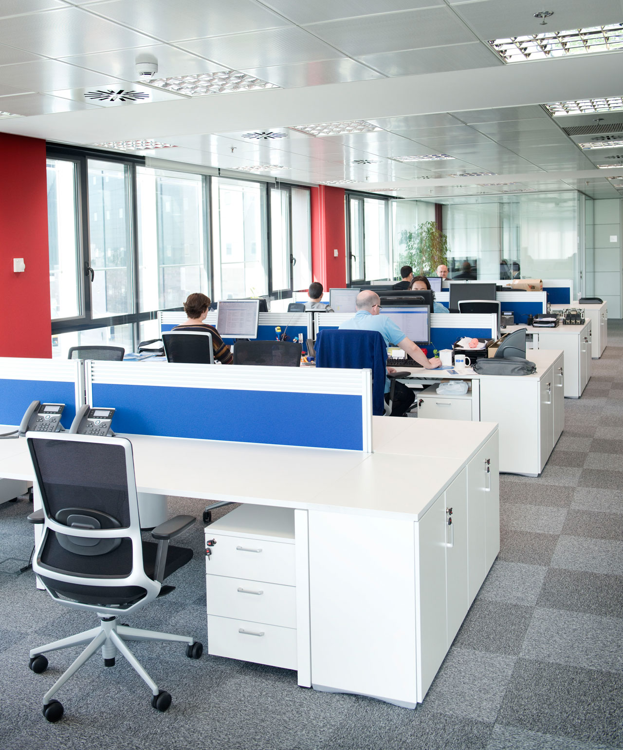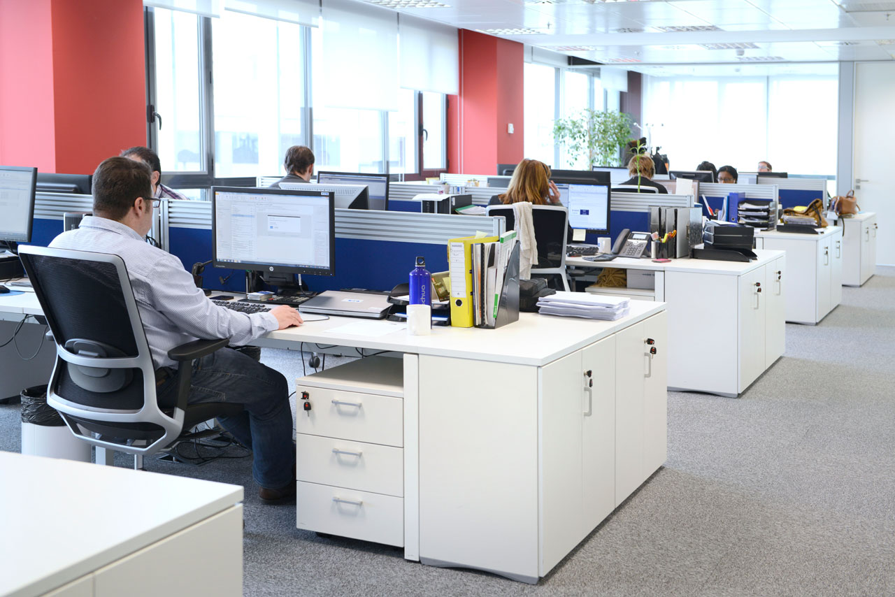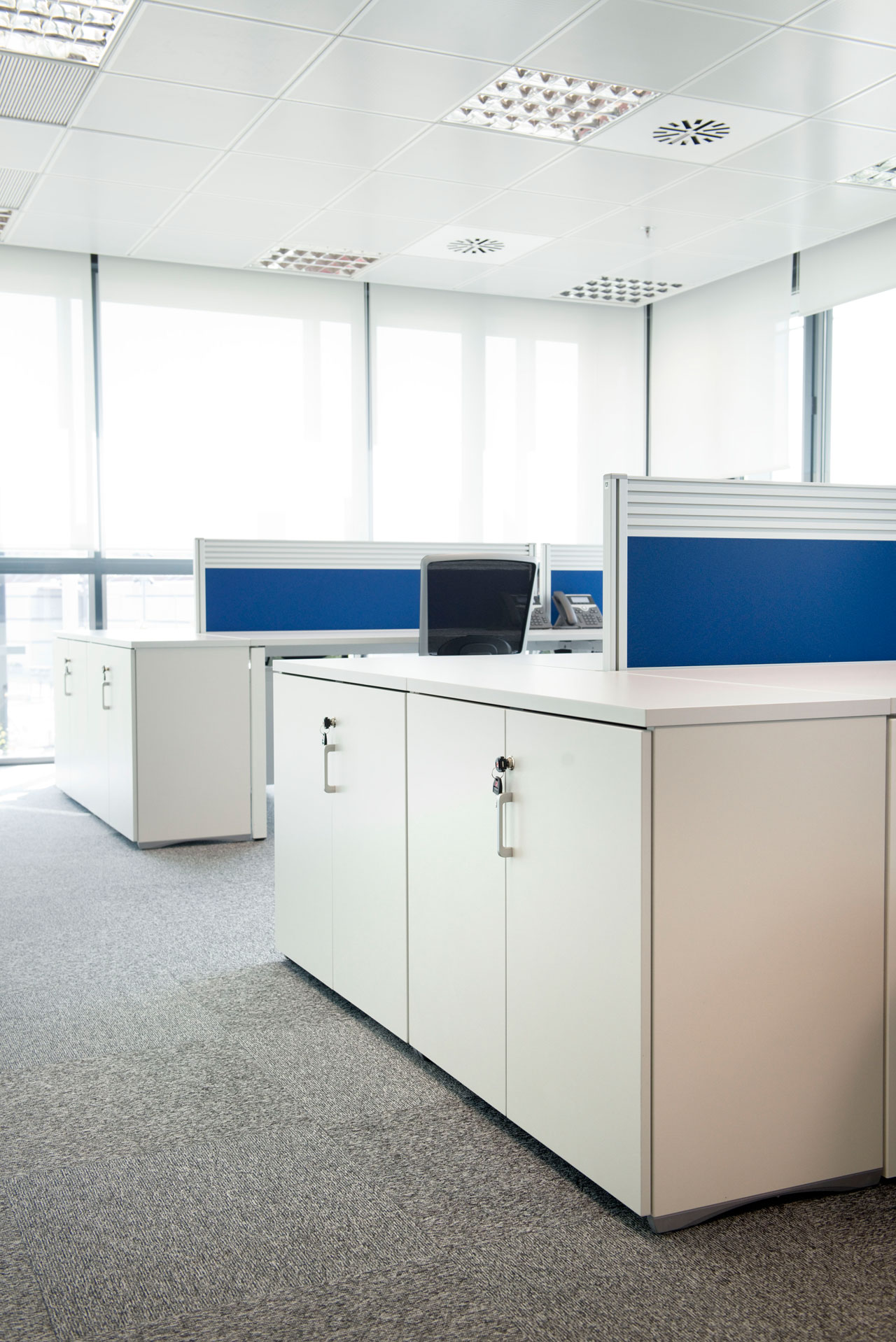 La composición de los puestos operativos se ha realizado siguiendo mayoritariamente el sistema bench. La mesa Vital Plus, ha sido elegida por sus múltiples opciones de configuración: como mesa individual, colectiva, con estructura de patas o marco cerrado e incluso con tablero desplazable. Para facilitar el archivo de documentación personal se ha colocado un Buck con ruedas en cada lugar de trabajo, mientras que los armarios metálicos a la misma altura de la mesa quedan destinados a uso general al tiempo que delimitan cada zona.