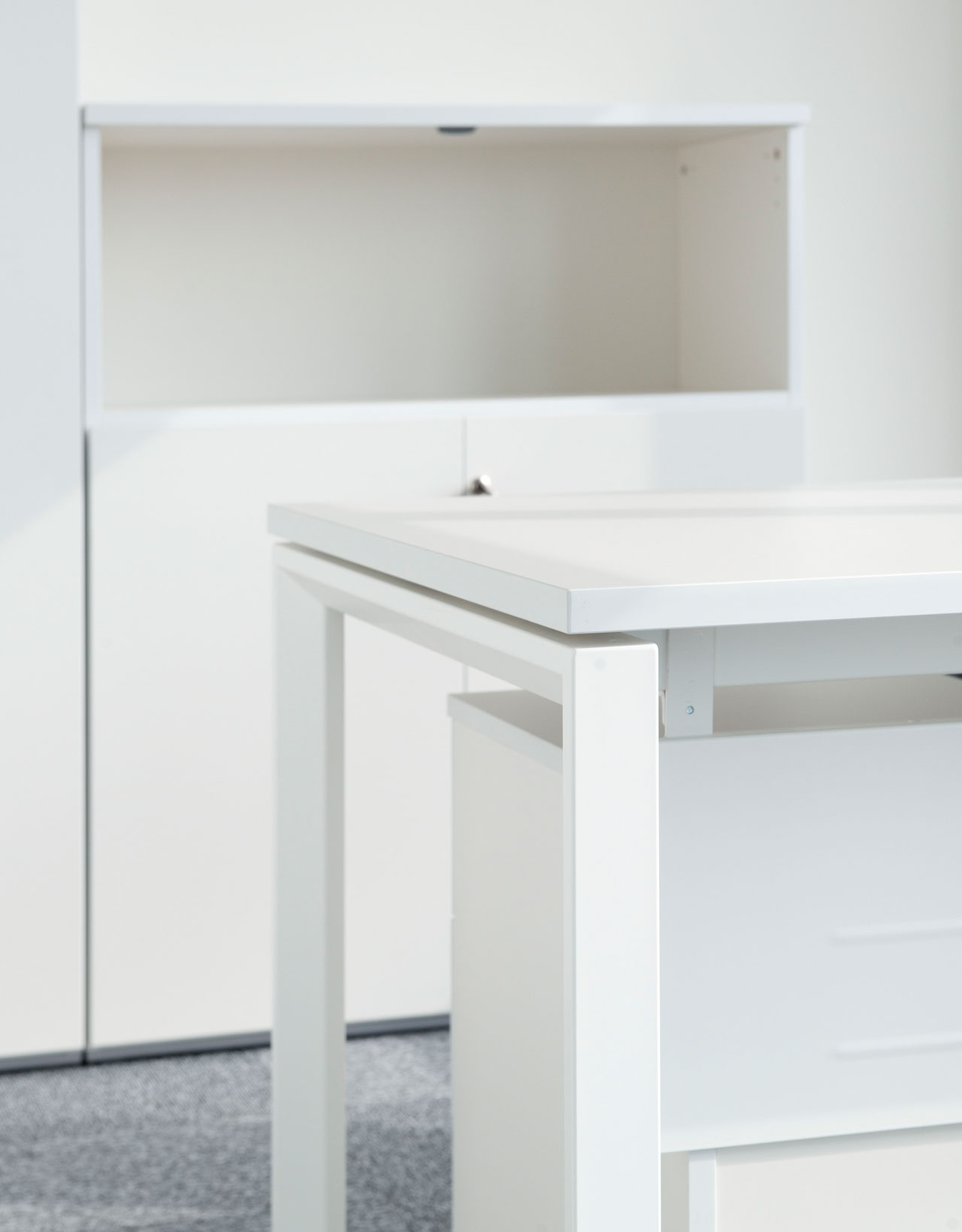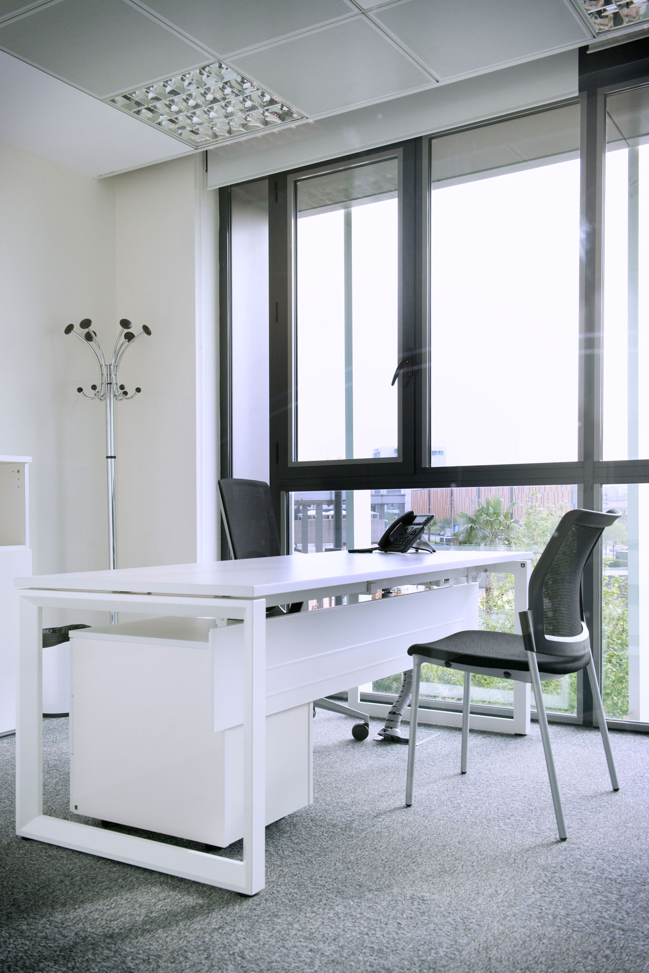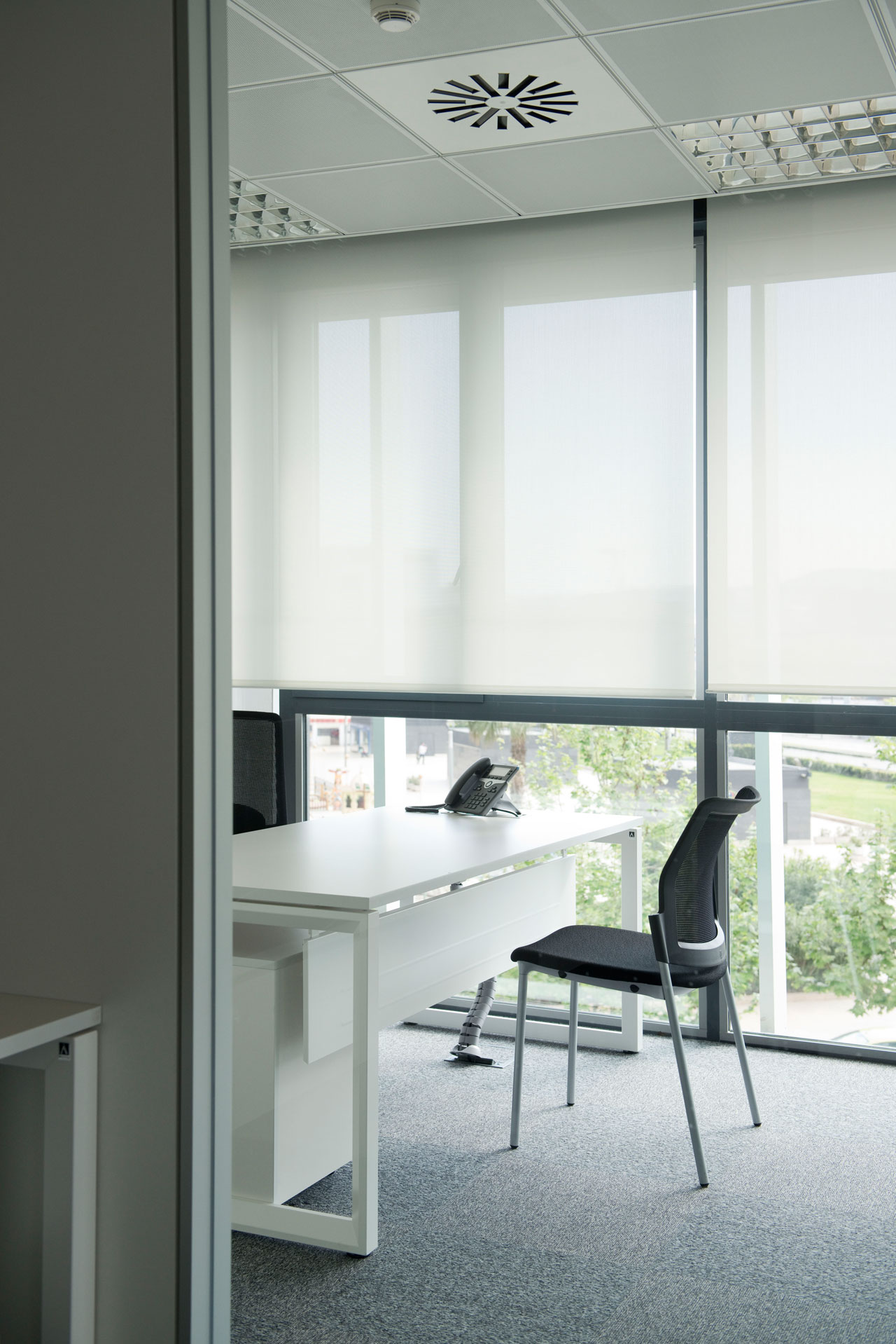 La composición de los puestos operativos se ha realizado siguiendo mayoritariamente el sistema bench. La mesa Vital Plus, ha sido elegida por sus múltiples opciones de configuración: como mesa individual, colectiva, con estructura de patas o marco cerrado e incluso con tablero desplazable. Para facilitar el archivo de documentación personal se ha colocado un Buck con ruedas en cada lugar de trabajo, mientras que los armarios metálicos a la misma altura de la mesa quedan destinados a uso general al tiempo que delimitan cada zona.