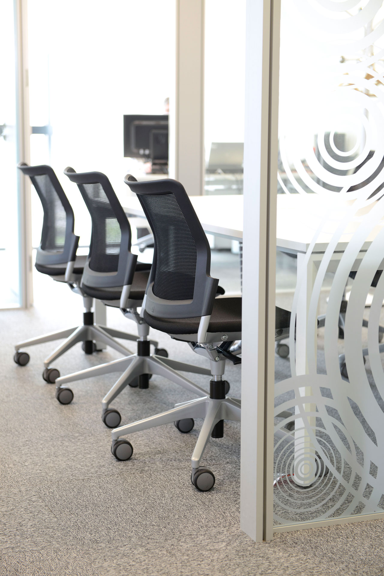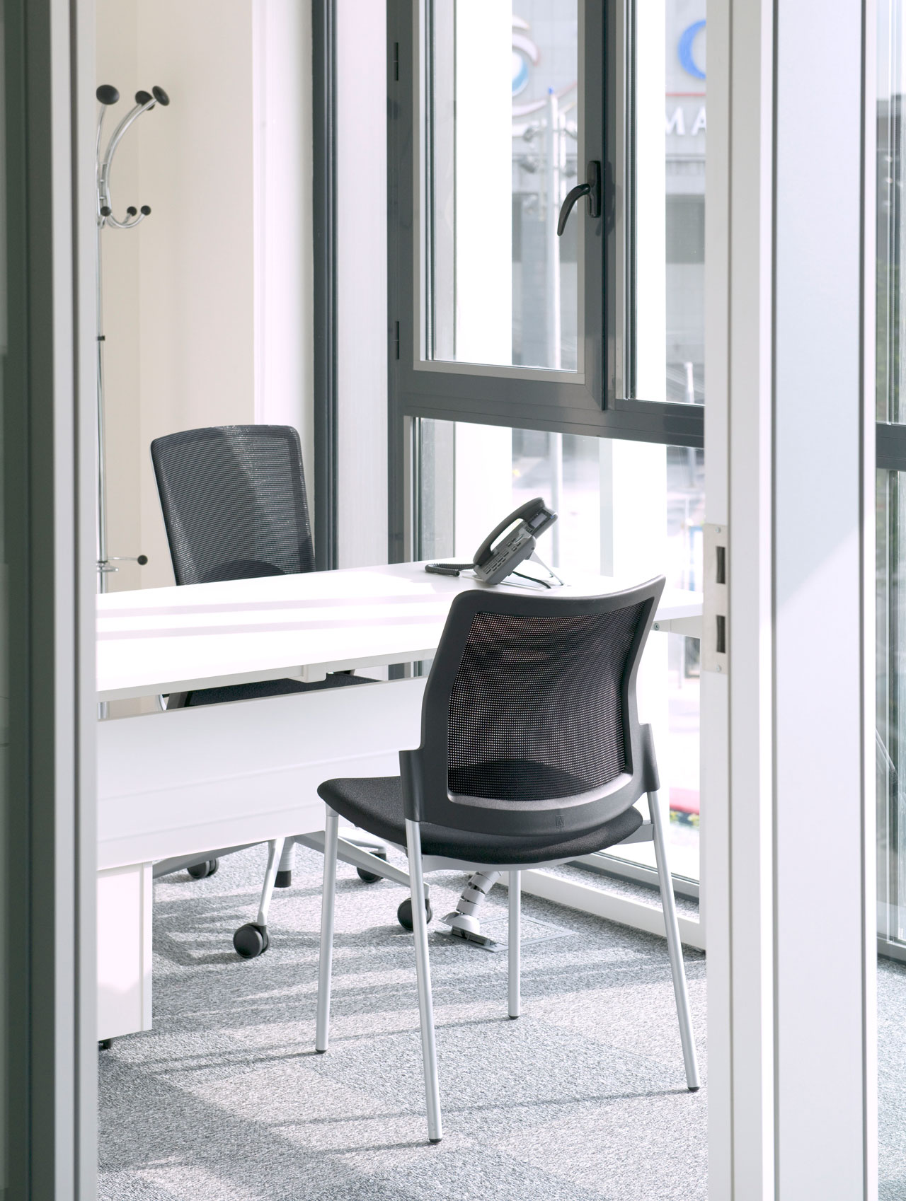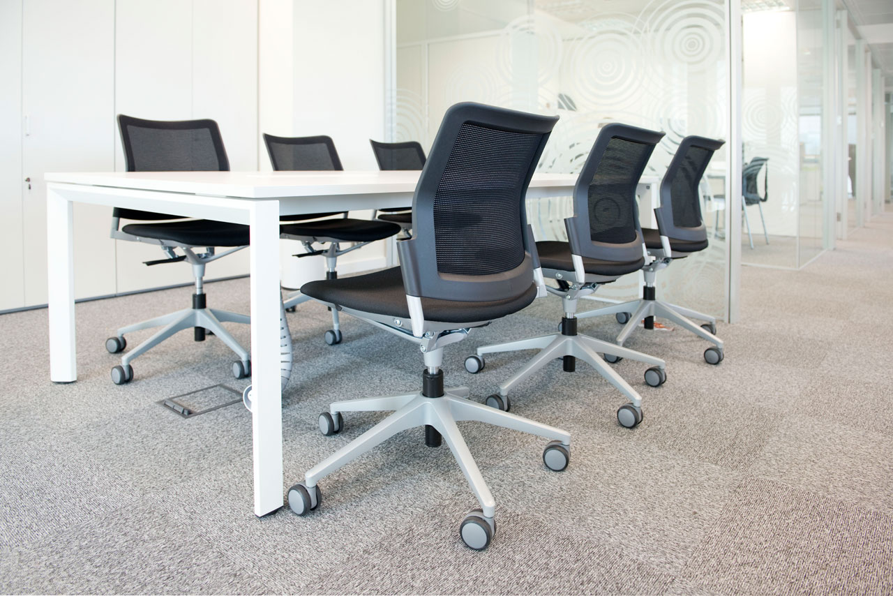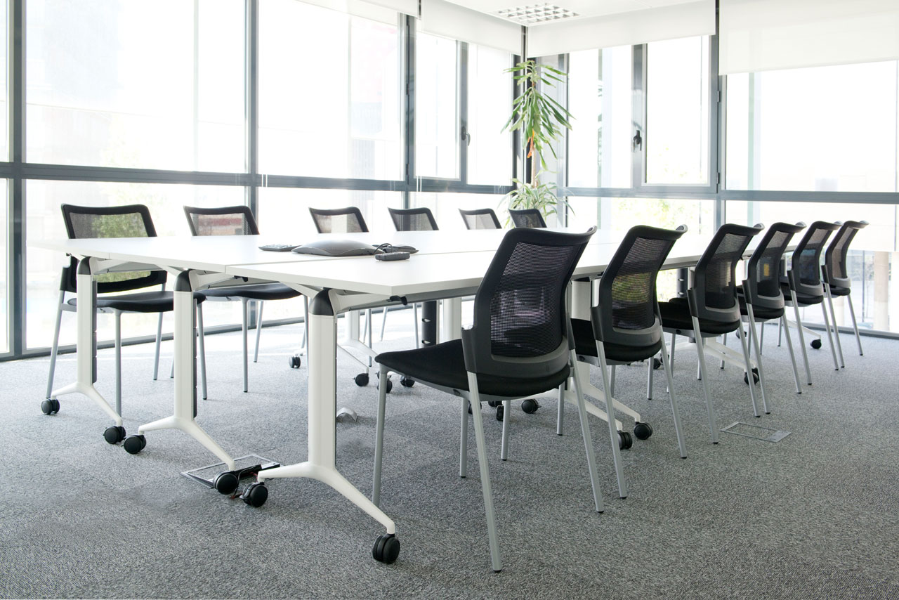 Para las reuniones se han diseñado varias salas con planteamientos diferentes para que puedan cubrir las diferentes necesidades planteadas. En una de ellas se ha instalado la mesa Vital Plus y la silla Urban Plus con ruedas y respaldo de malla elástica que envuelve la espalda del usuario aportándole una gran comodidad.