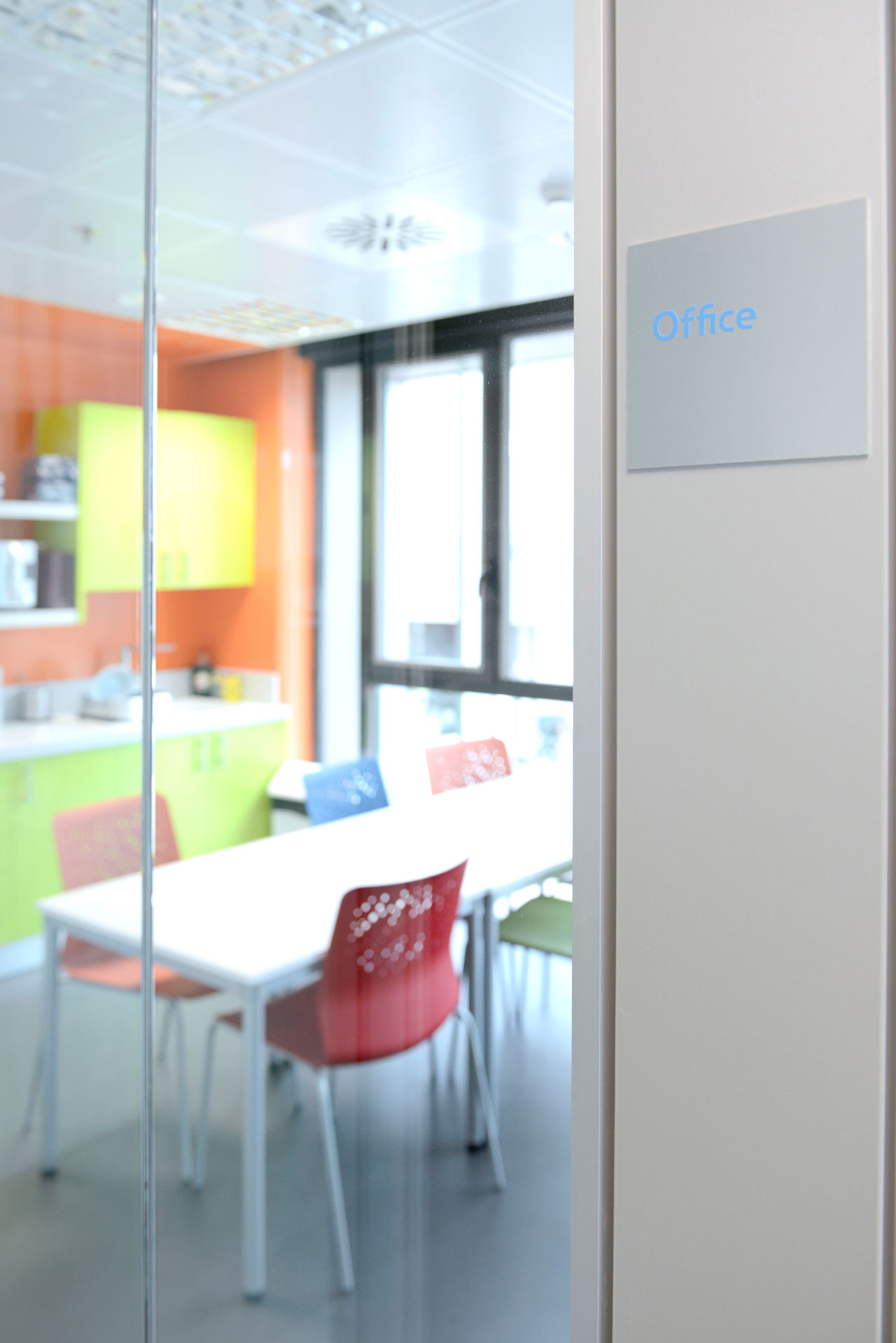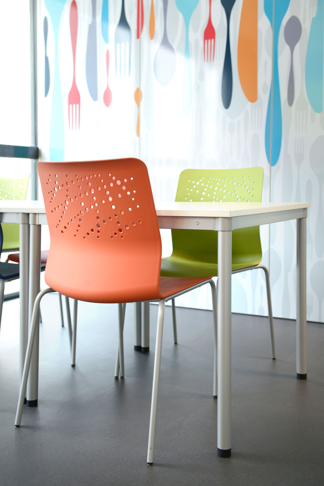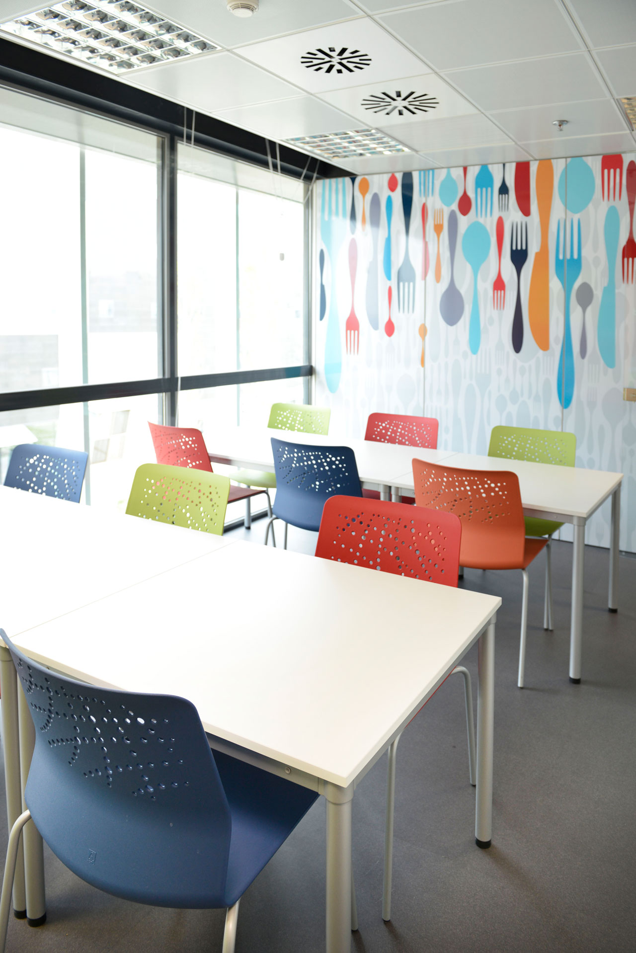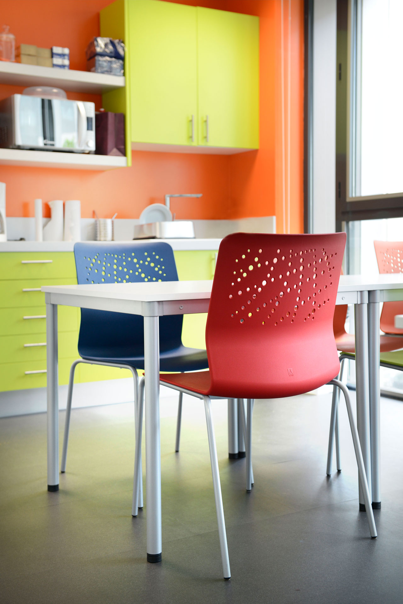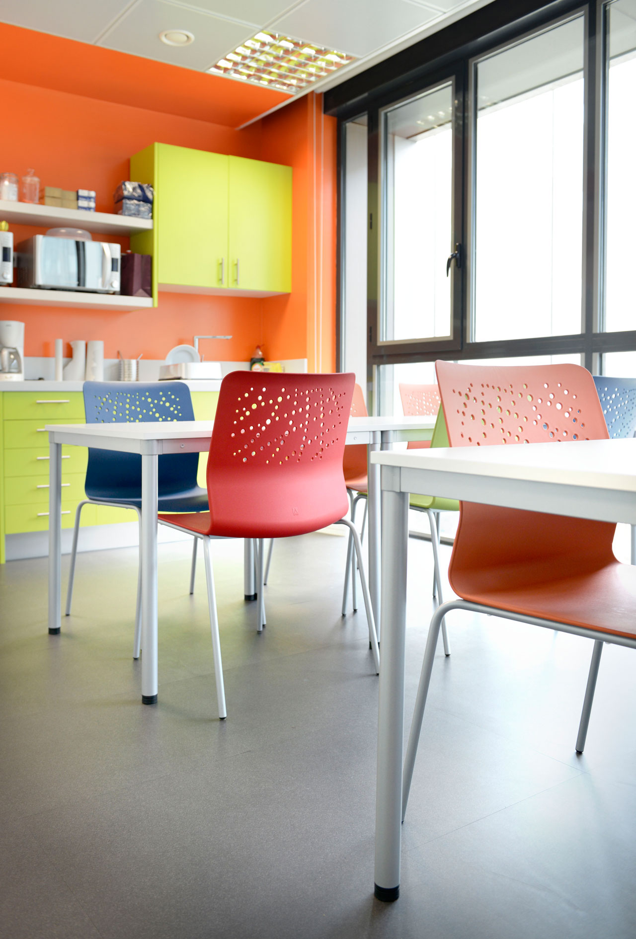 La combinación de colores y mobiliario ha conseguido crear un ambiente relajado y desenfadado para esos momentos de descanso entre compañeros. La mesa Dynamic, muy funcional, aporta un punto de sobriedad a la sala.