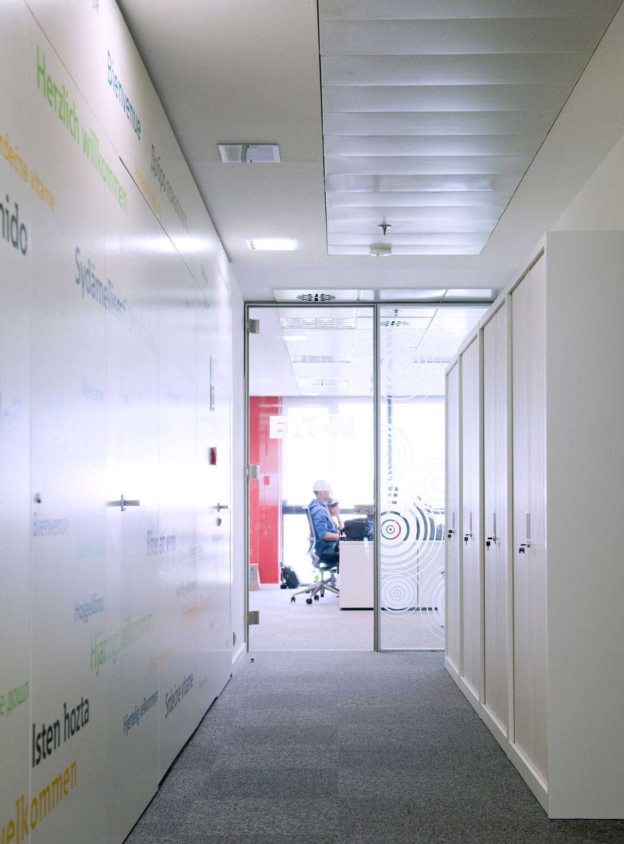 En el área de oficinas destaca la claridad, potenciada por el blanco del mobiliario, la amplitud de los ventanales y el cristal decorado con vinilos empleado para delimitar estancias. El azul corporativo está presente en algunos toques divertidos como las divisorias Split de los puestos operativos, el logo o el mostrador de la entrada. El objetivo ha sido reflejar uno de los valores de la empresa: la transparencia.