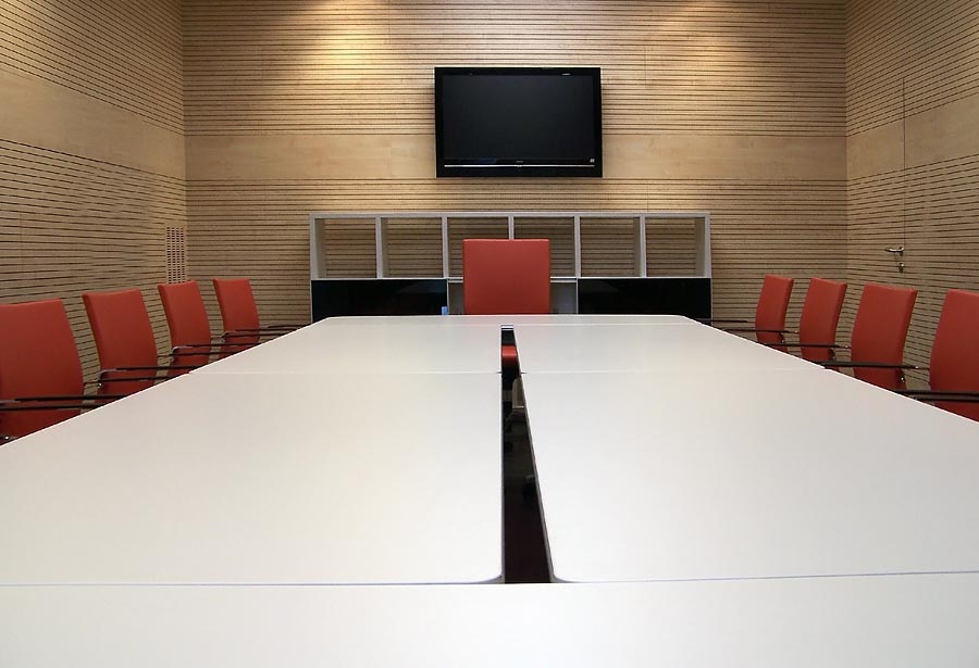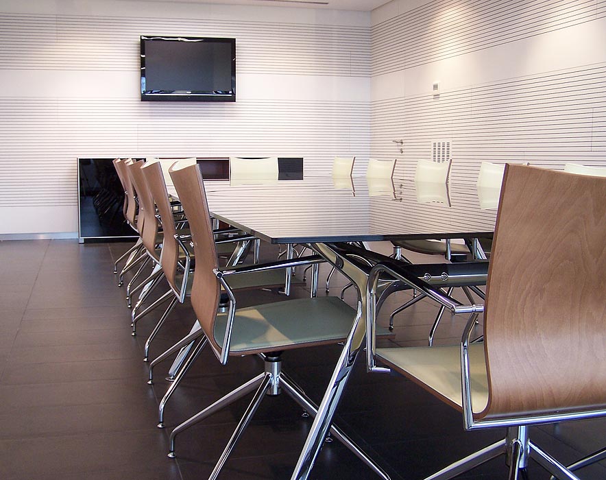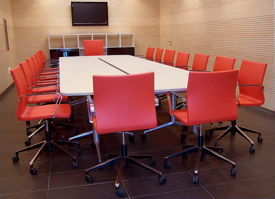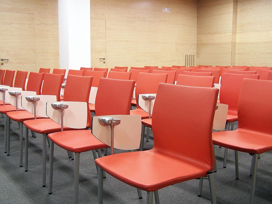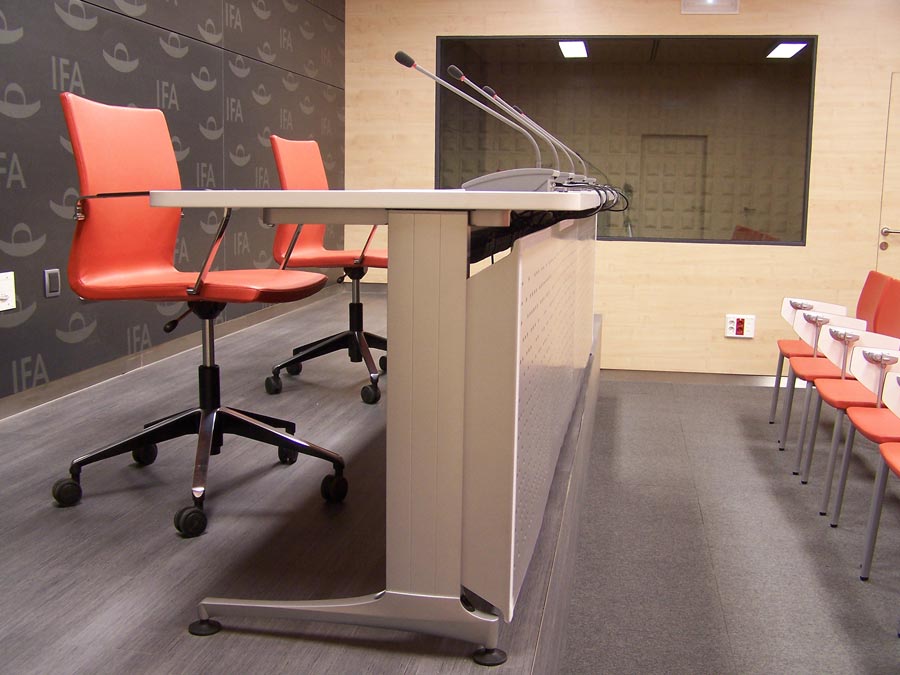 El auditorio nos muestra otra de las posibilidades del programa Informa, en este caso adaptado para mesa de conferencias, con sistema de electrificación integrado para los micrófonos. La silla Uma, con elevación a gas, ruedas y reposa brazos está presente en la tarima que hace las veces de escenario.