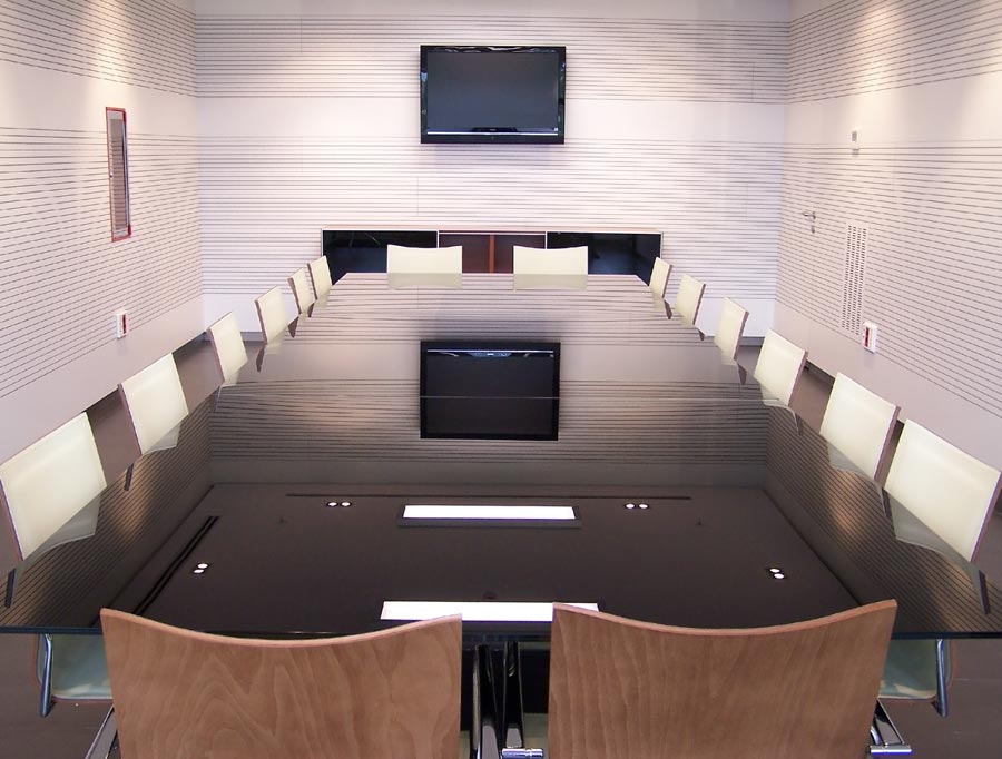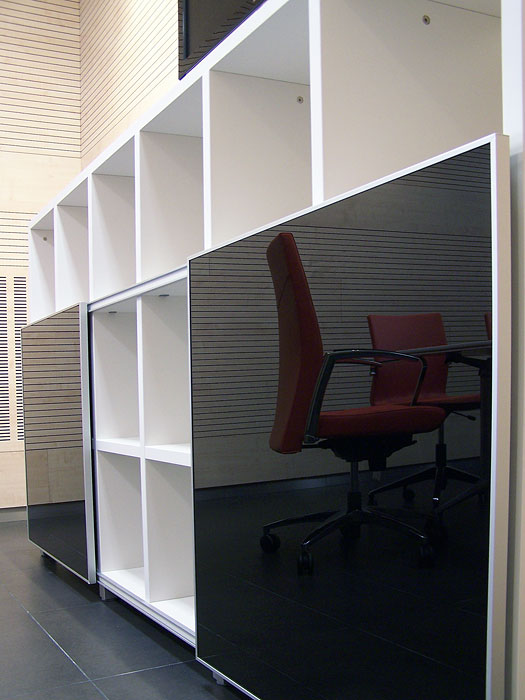 Cubic ha proporcionado, con una estética moderna, la solución de archivo a las diferentes estancias, salas de reunión, aulas formativas, etc. Algunas partes del mueble quedan cerradas con puertas correderas en cristal negro de seguridad y marco de aluminio.