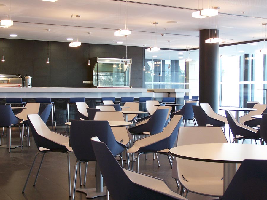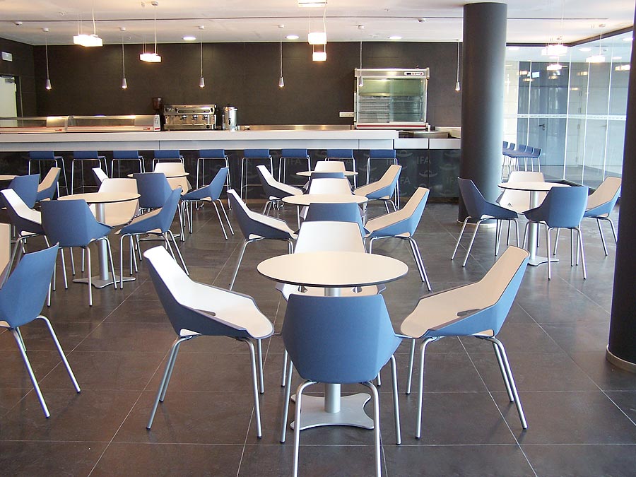 La frescura y el juego cromático han sido las premisas que han marcado la selección del mobiliario para la cafetería. El resultado; la silla Viva con carcasa azul y acolchado blanco, complementada con mesas redondas de Colectividades. Una configuración muy práctica diseñada para un uso intensivo.