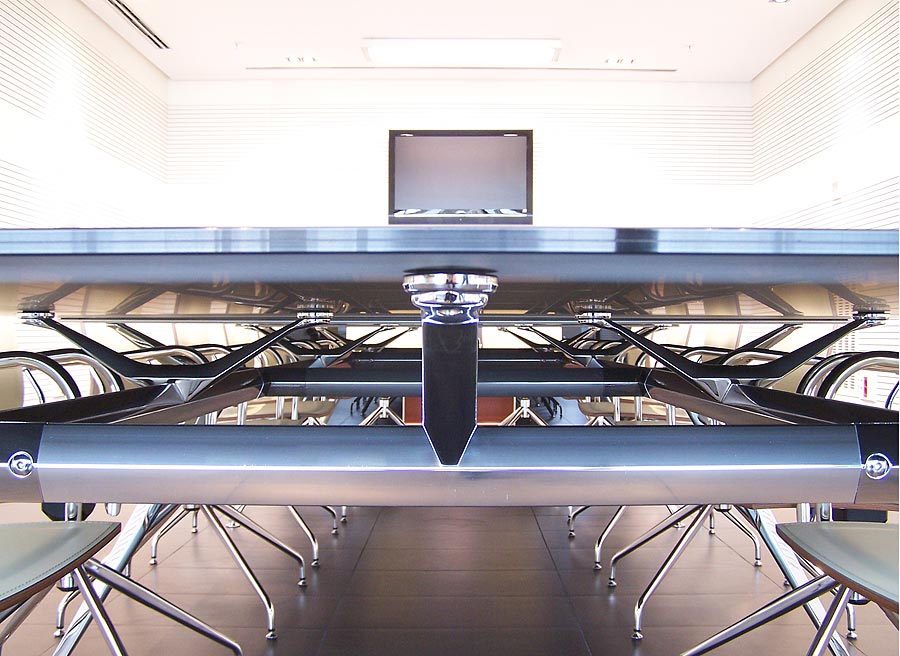 En las salas de reunión se ha instalado la mesa Arkitek, con su impactante estructura cromada y superficie en vidrio negro. Le acompaña la elegante silla Ikara, de formas limpias y esbeltas con acabado en madera lacada e interior tapizado en piel color crema. Una propuesta de mobiliario exclusiva, con una presencia visual selecta.