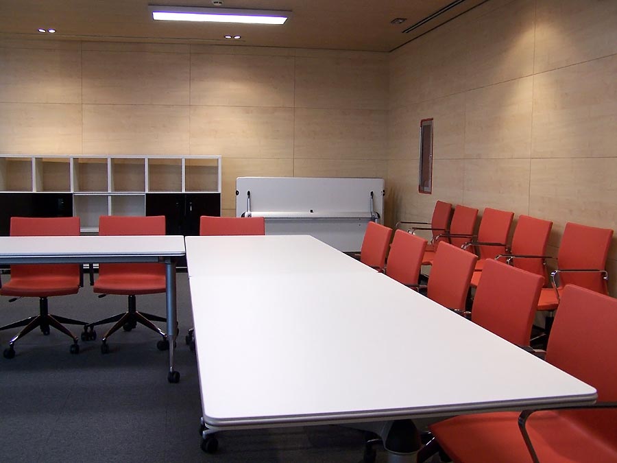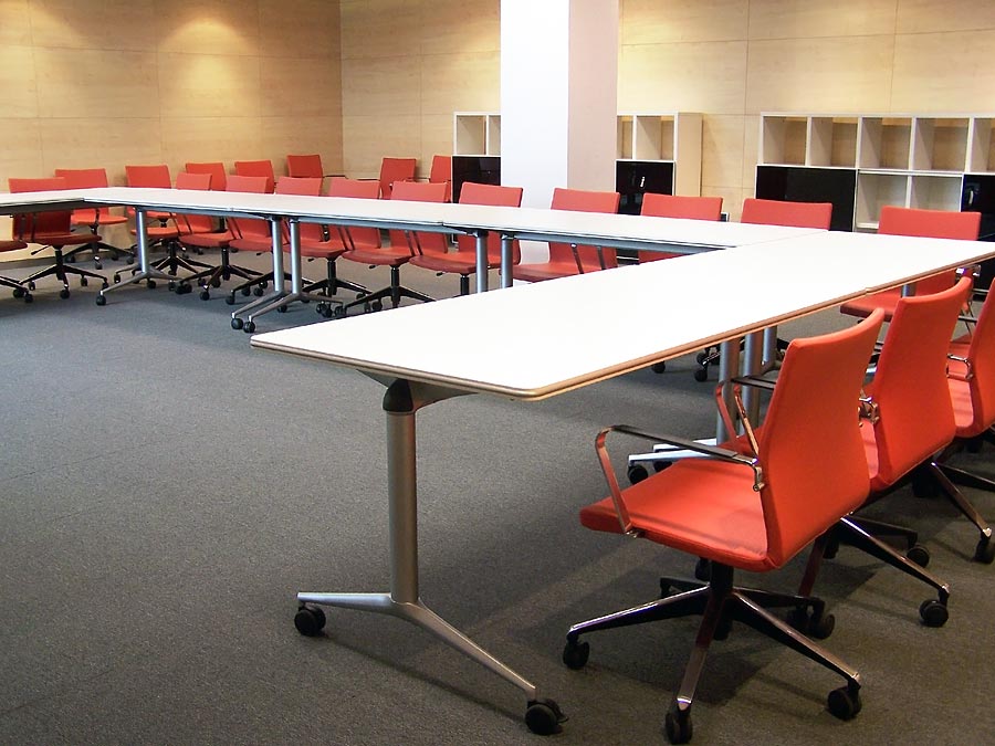 En las aulas de formación se ha optado por emplear una mesa polivalente que permita ofrecer a la sala movilidad sin que el equipamiento condicione en ningún momento la distribución. El mobiliario debía adaptarse a las necesidades de la sala y no viceversa. Trama ha sido la solución.
