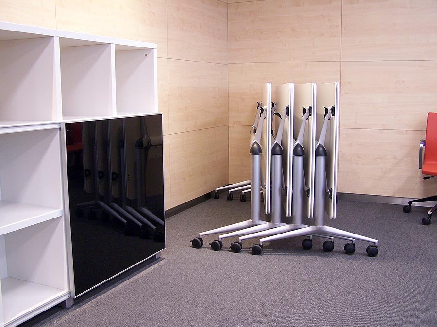 Una mesa con ruedas y abatible, con un diseño sencillo y versátil, que garantiza la máxima movilidad y permite crear múltiples configuraciones en función de la actividad que se vaya a realizar, o del número de asistentes. A la sillería se le ha dado continuidad eligiendo Uma también para estos espacios.