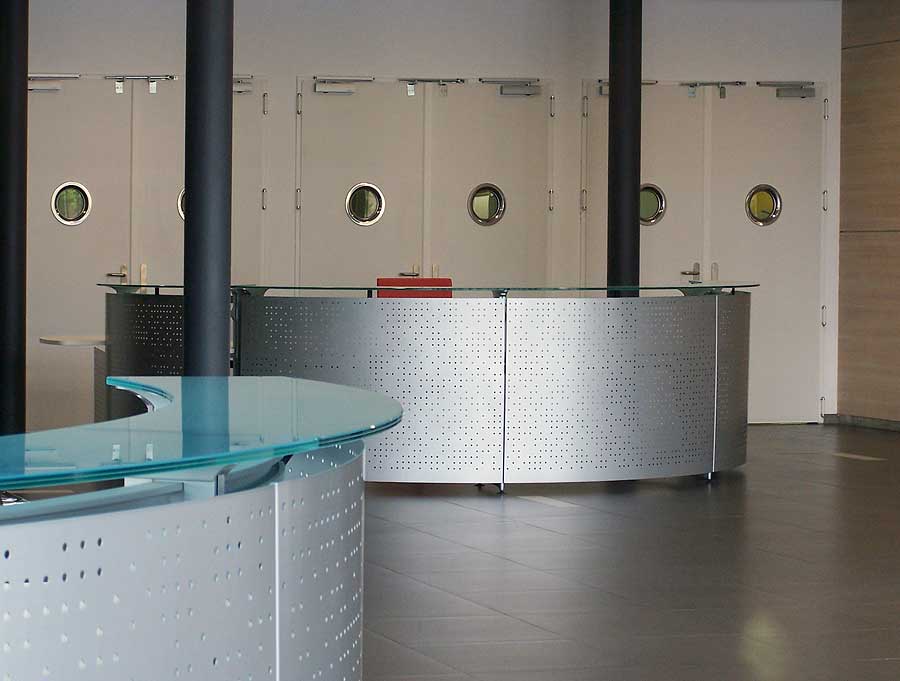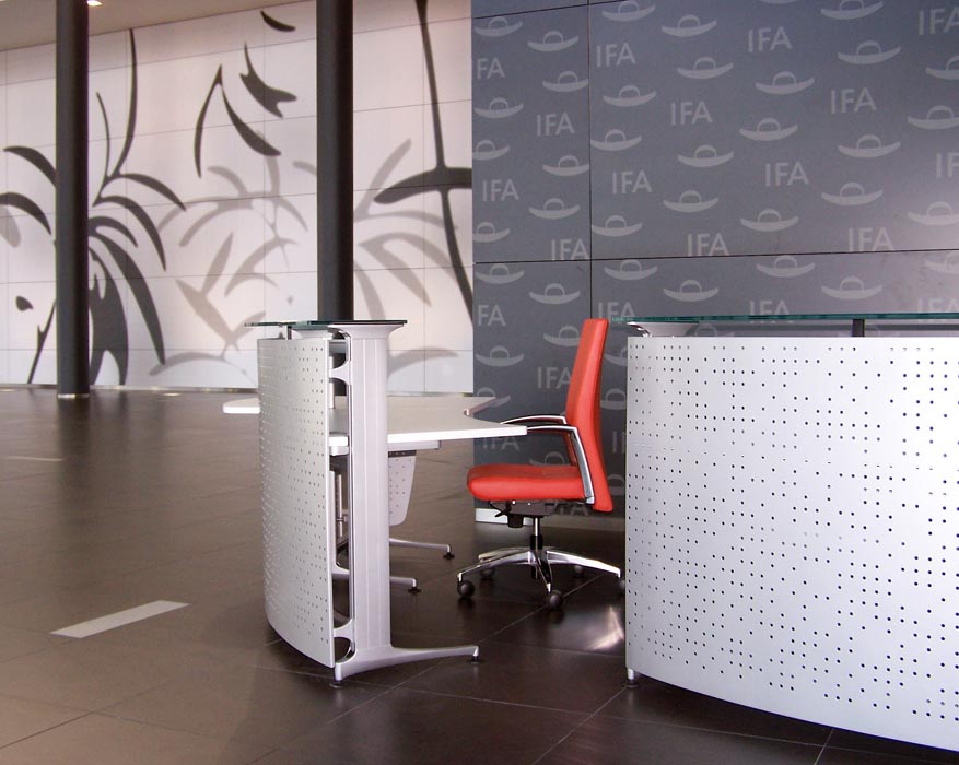 En el vestíbulo de entrada y recepción se han colocado varios mostradores del modelo Informa. Con un diseño vanguardista y combinando el cristal y el metal, se integra perfectamente en el entorno donde predominan los mismos materiales. Complementa la composición el sillón direccional Kados, tapizado en rojo.