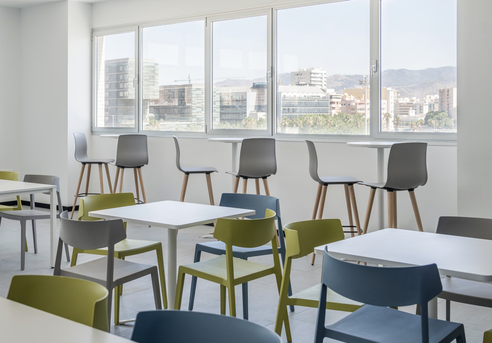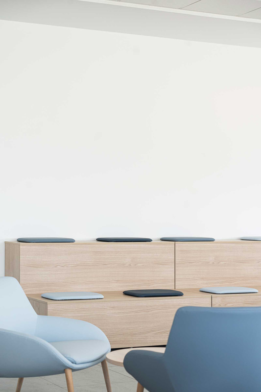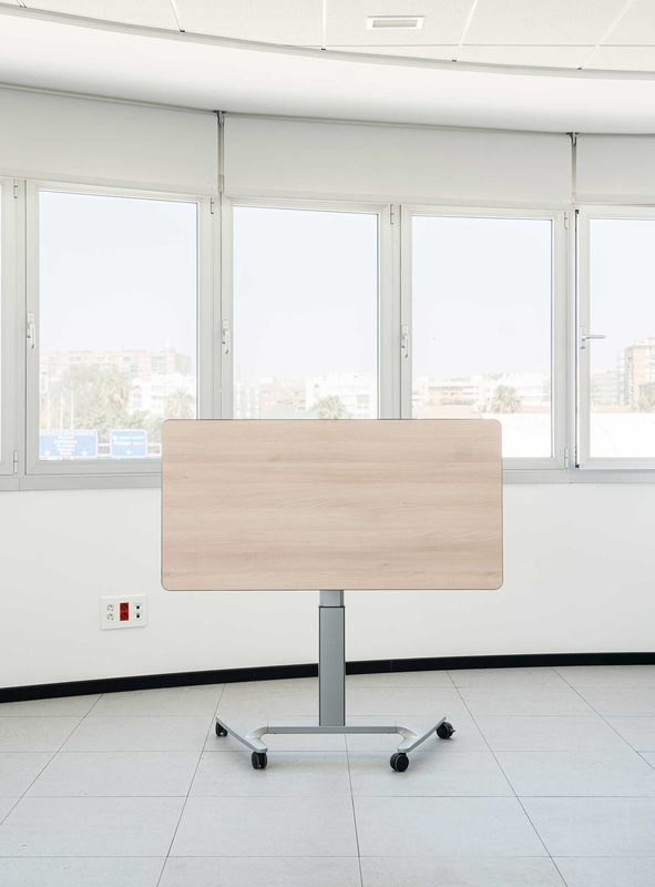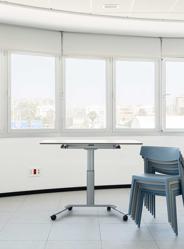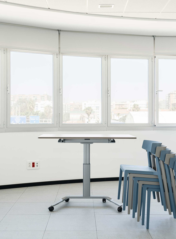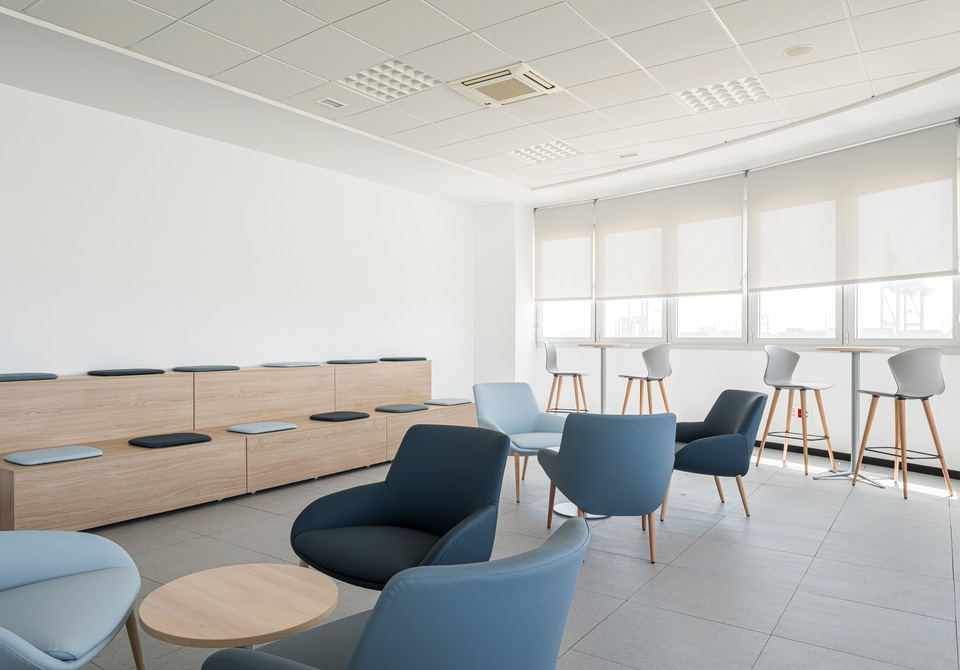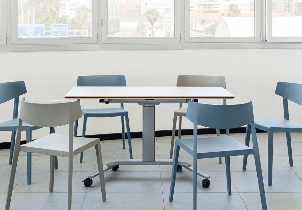 Para añadir versatilidad, sin dejar de lado la estética ni el confort, las áreas más flexibles combinan las elevables, móviles y abatibles mesas Talent, con unas ligeras y apilables sillas Wing. En la sala multiusos, una grada con pufs dinamiza un espacio con distintos ambientes, donde los trabajadores pueden elegir entre sentarse en los taburetes Whass acompañados por mesas altas Tabula, o unos acogedores sillones Noom.