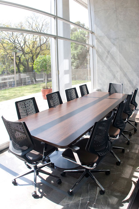 En las salas de juntas y reunión se ha elegido la mesa Peana, en este caso rectangular, con canto redondeado y dos bases circulares como estructura de apoyo. La silla Tnkid se ha servido con elevación a gas con ruedas y el respaldo en negro. Para las reuniones con pocos participantes se ofrece la mesa Peana redonda, muy eficaz para un trato más cercano.