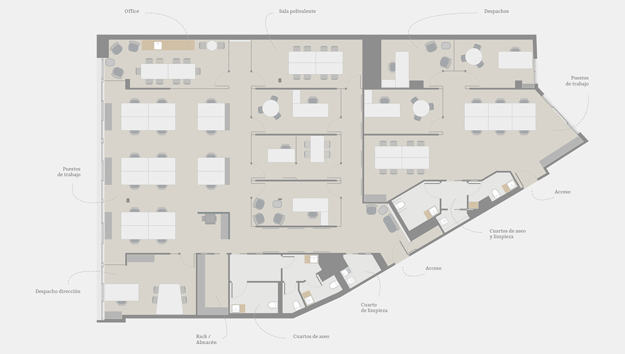 La prioridad de las oficinas era facilitar el flujo de luz de un lado al otro del espacio, así como asegurar el contacto visual entre los espacios sin perder iluminación. Todo ello en un espacio amplio y diáfano, donde prima la funcionalidad, en el que también se precisan de salas de privacidad, de reuniones y espacios de concentración.