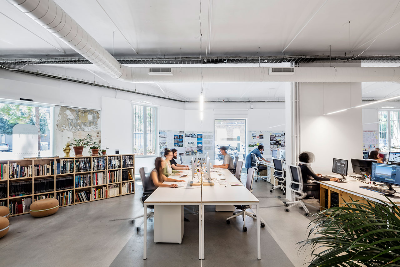 Con una superficie de 460 metros cuadrados, sus oficinas se organizan en dos mitades. Una se configura como espacio abierto y sin jerarquías. Y la otra alberga una biblioteca y una amplia variedad de salas de reuniones. Una concepción que fomenta un estilo de trabajo dinámico y flexible a partir de una filosofía de cooperación que definen como ‘inteligencia colectiva’ y que impulsa la innovación en cada proyecto. Una manera de trabajar que se nutre a partir de un equipo transversal formado por arquitectos, periodistas, historiadores, economistas y educadores.