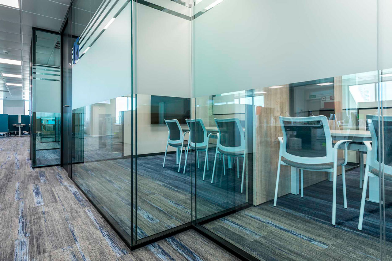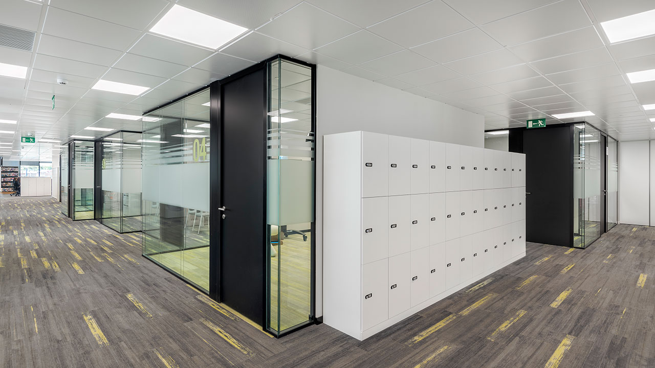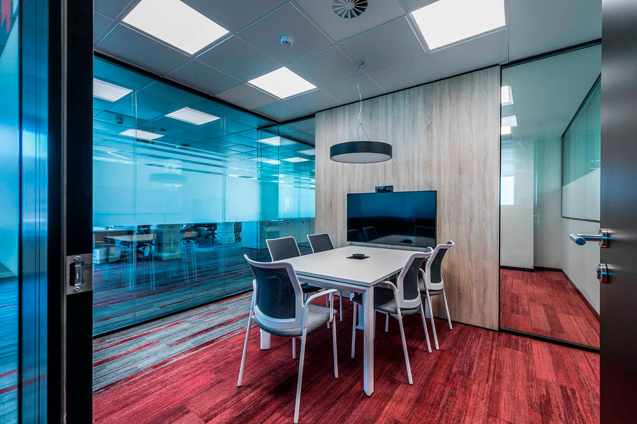Como resultado de una filosofía de trabajo transparente y participativa, y una organización mucho más horizontal, se han eliminado también los despachos para directivos. Diáfanas y abiertas, las salas se llenan de puestos no asignados, fruto del carácter nómada del trabajo actual. Las mesas se alternan con cubículos Longo POD que, aislados acústicamente con paneles fonoabsorbentes, acogen en su interior espacios privados para trabajo colaborativo. Acorde con el del suelo, el color de la tapicería aporta calidez y fomenta la creatividad.