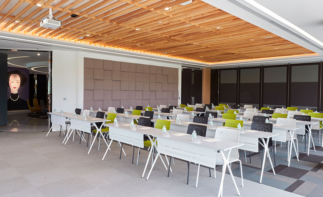 Al otro lado de la planta, otras dos salas ofrecen más espacio para posibles eventos. En todas ellas, y para dar respuesta a la flexibilidad que caracteriza el proyecto, los arquitectos han apostado por Actiu, que, de la mano de su socio en Tailandia, Wurkon, ha participado con productos apilables, fácilmente transportables y plegables, como las sillas Urban Block o las mesas Plek.