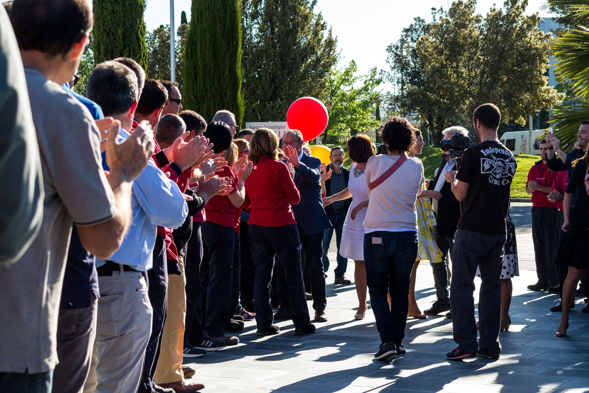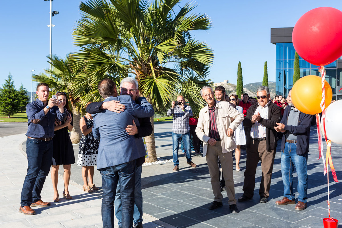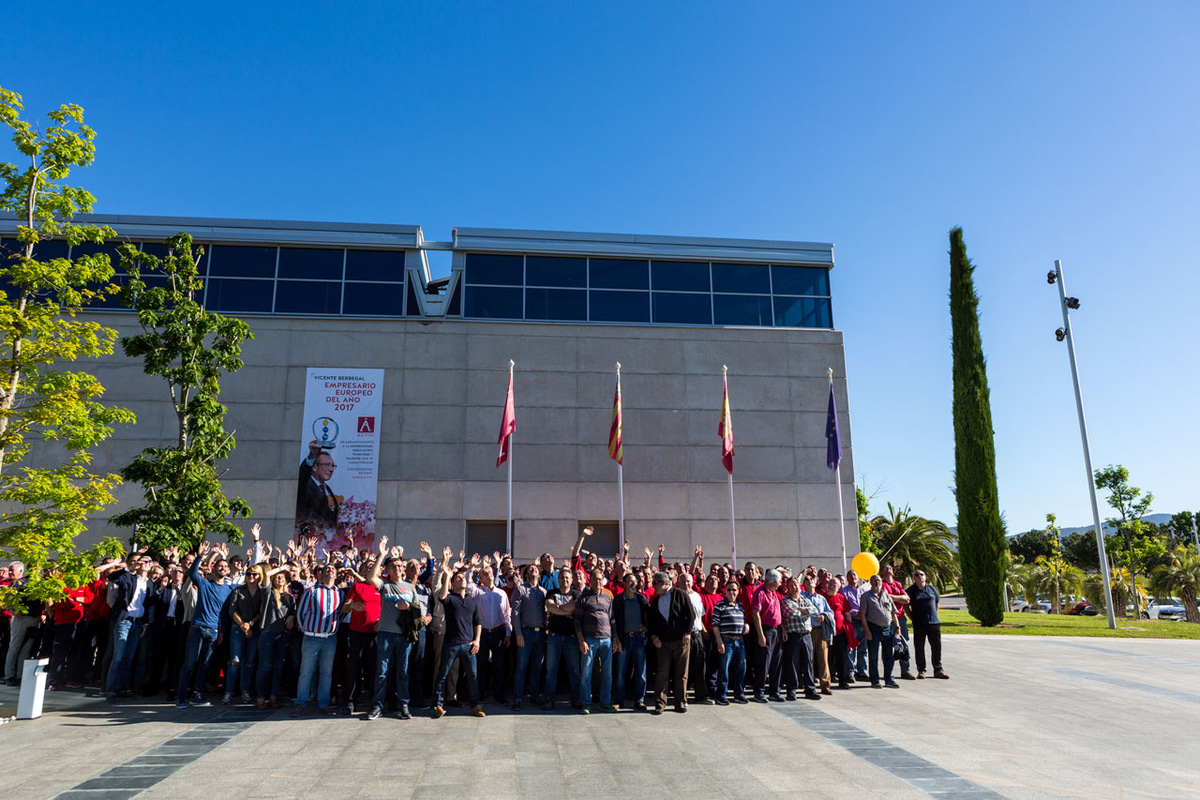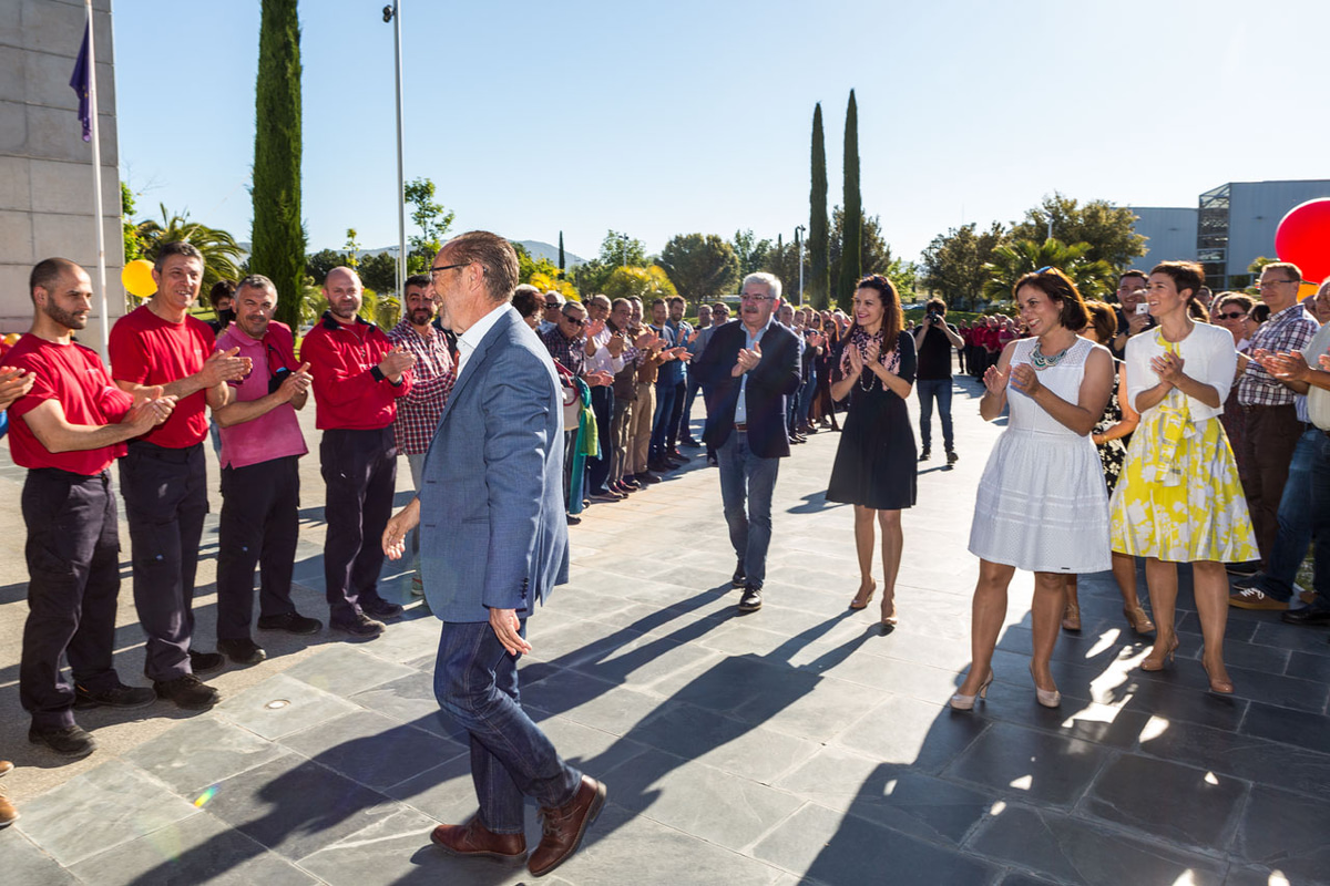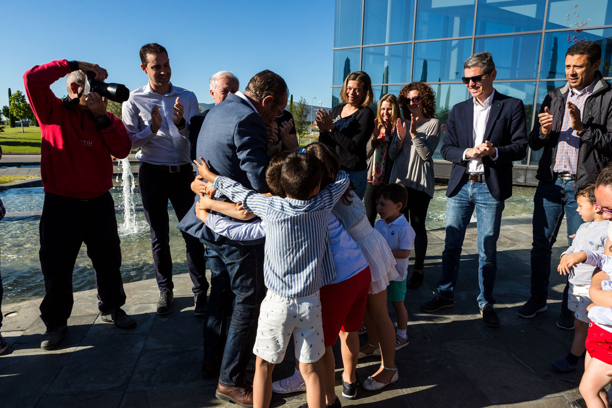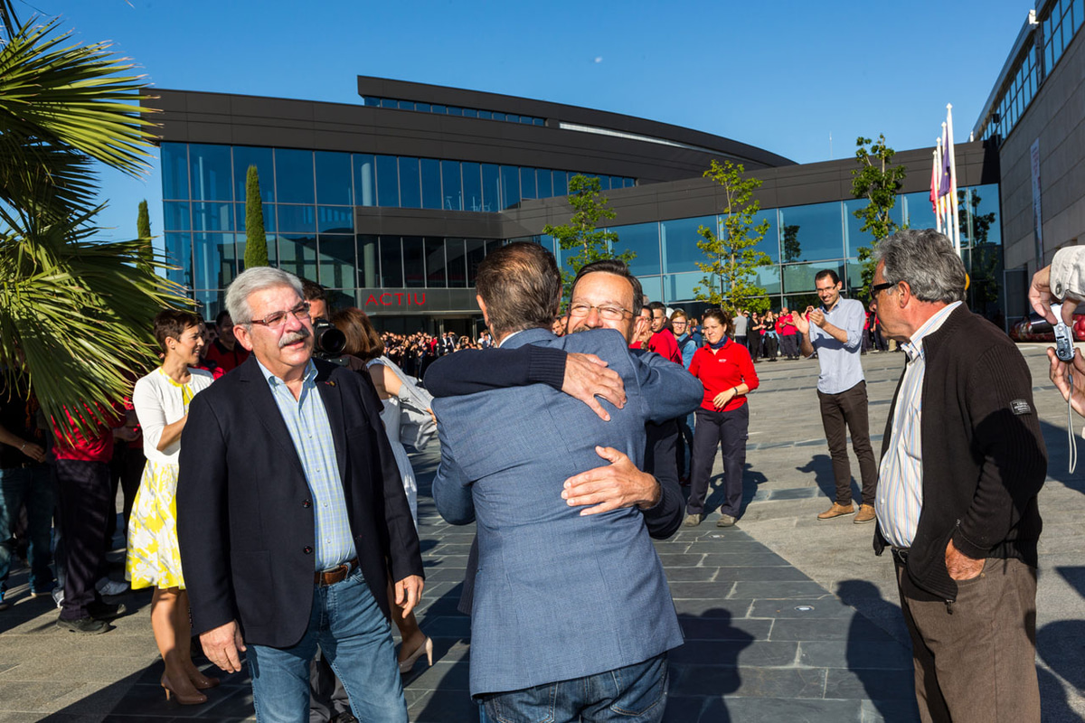 Les 285 travailleurs d’Actiu, rejoints par des collaborateurs et d’anciens employés, avaient rendez-vous au Parc Technologique lundi en début de matinée (le gala de remise des prix s’étant tenu jeudi soir en Croatie), pour accueillir Vicente Berbegal. Le fondateur du Groupe Actiu s’était rendu à son entreprise en pensant qu’il devait assister à une réunion. Quel ne fut pas son étonnement quand il s’est retrouvé au cœur d’un hommage surprise préparé par les employés et sa famille.