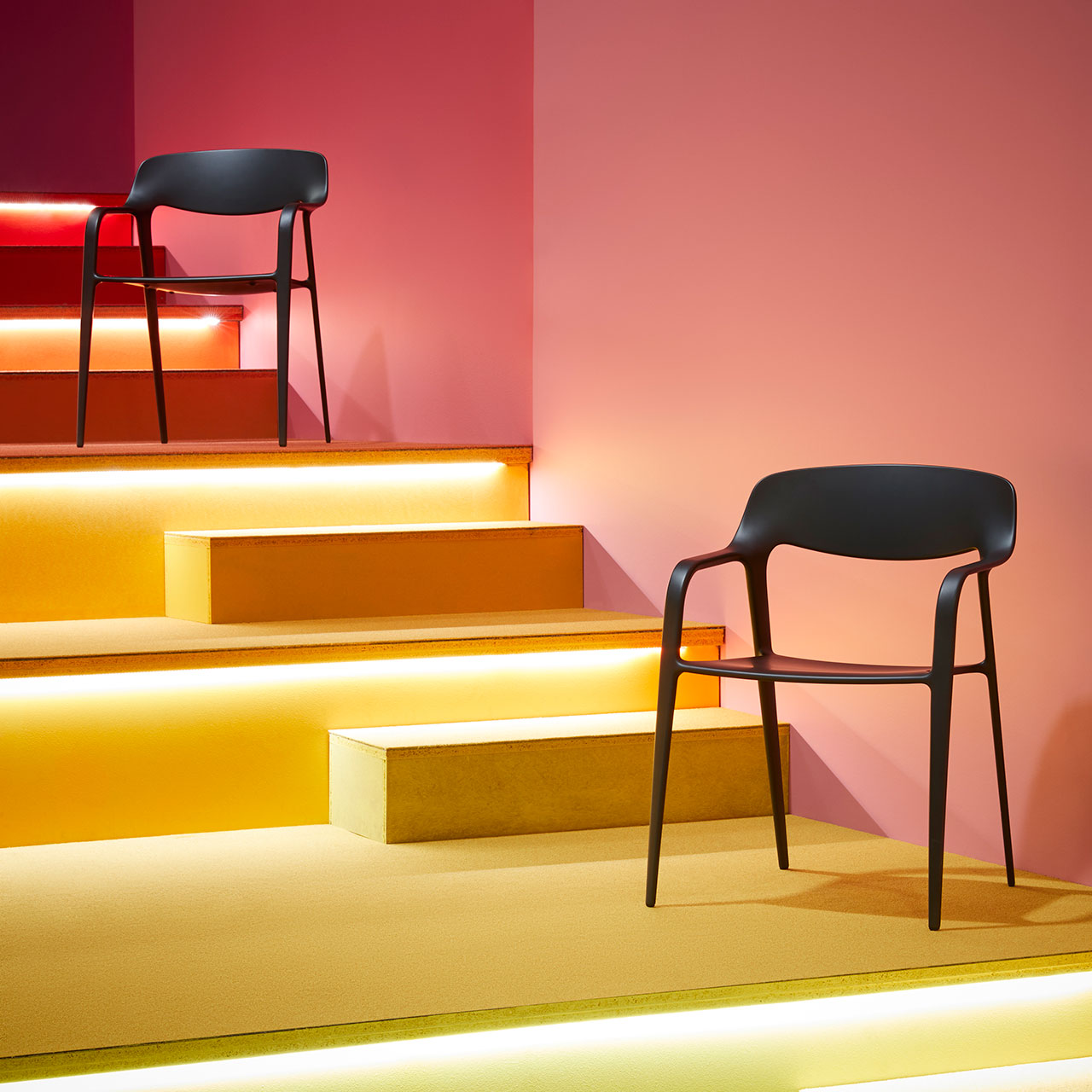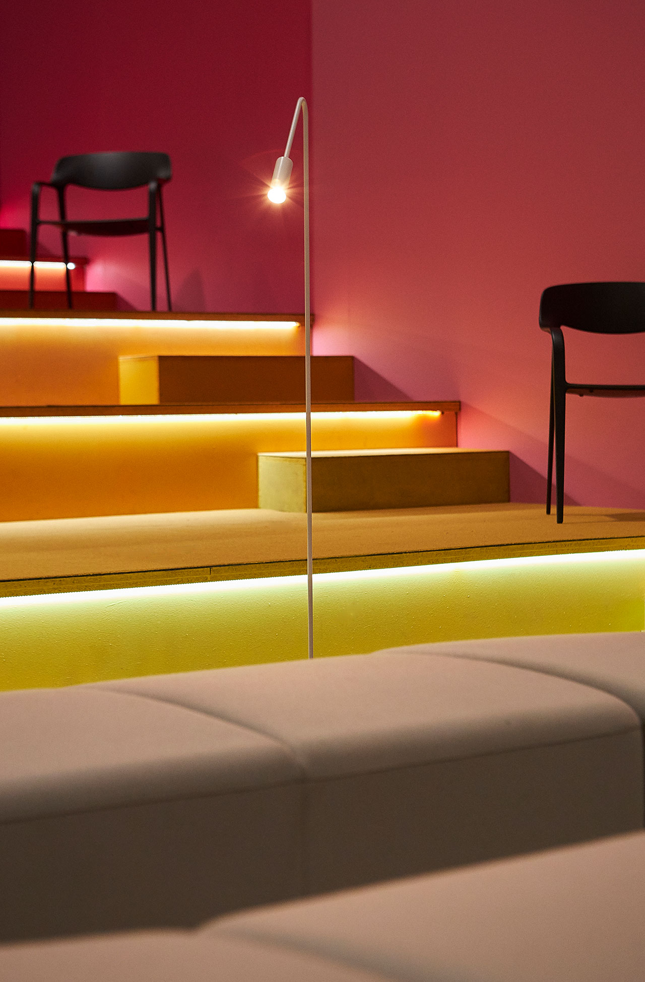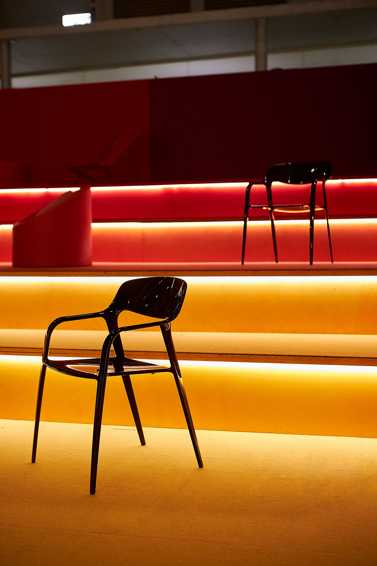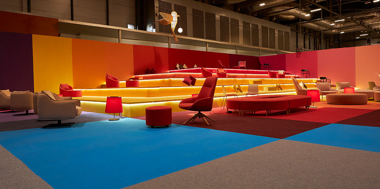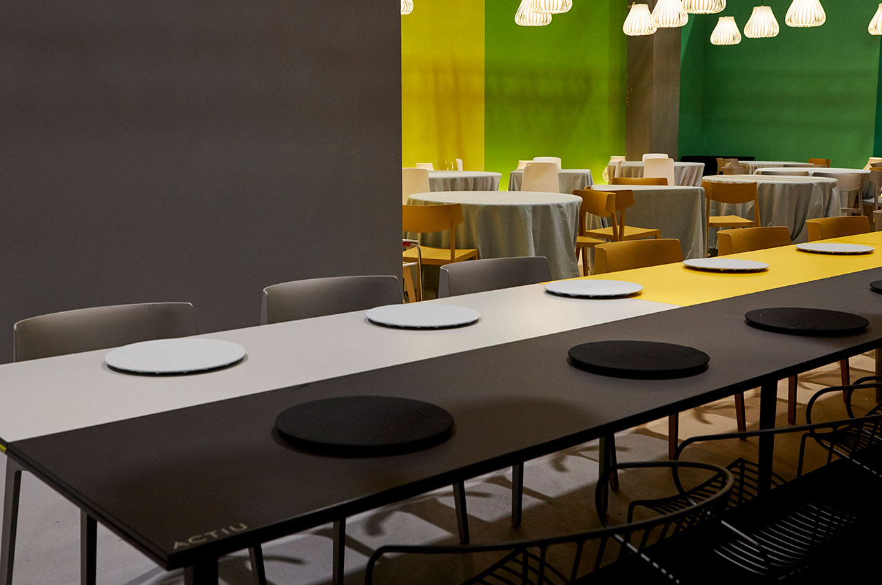 La philosophie d'Actiu, consistant à mettre les gens en relation dans le respect de l'environnement, s'est concrétisée par une grande table multicolore de 22 mètres de long où il était possible de prendre un café, travailler de manière isolée, déjeuner ou d'organiser une réunion. Réalisée à partir du programme Longo, 100% recyclable, et fabriquée avec des panneaux anti-empreintes et 0% formaldéhyde, cette table aux tons verts rappelait le concept de biophilie et la relation avec la nature, sans oublier la référence à l'engagement d'Actiu pour la durabilité et le bien-être. La chaise Karbon, une pièce emblématique en fibre de carbone ayant reçu le prix « Red Dot Product Design » en 2019, le système d'assise souple modulaire Bend et l'ensemble de la collection Noom, y compris la nouvelle chaise Noom 50, ont été présentés par Actiu au salon VIP, lequel a joué cette année avec la devise de la RED, « La couleur ».