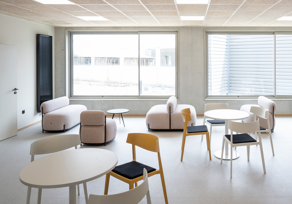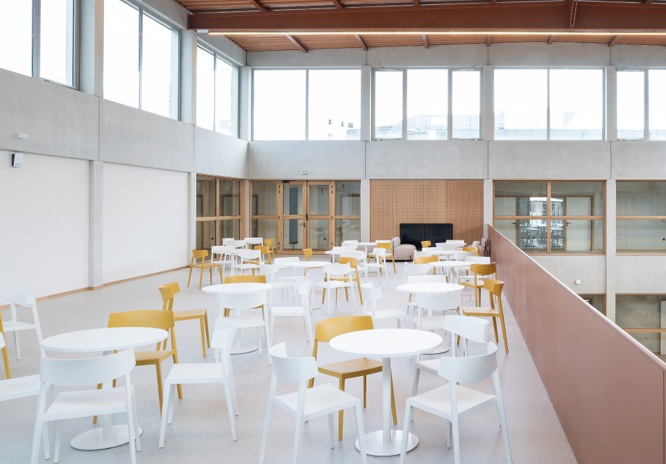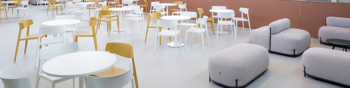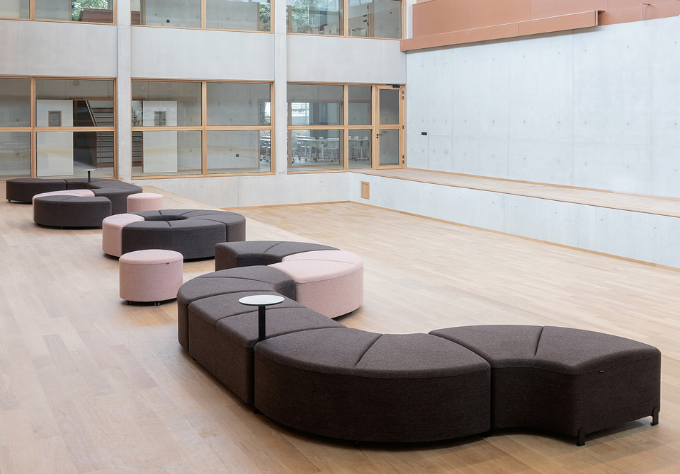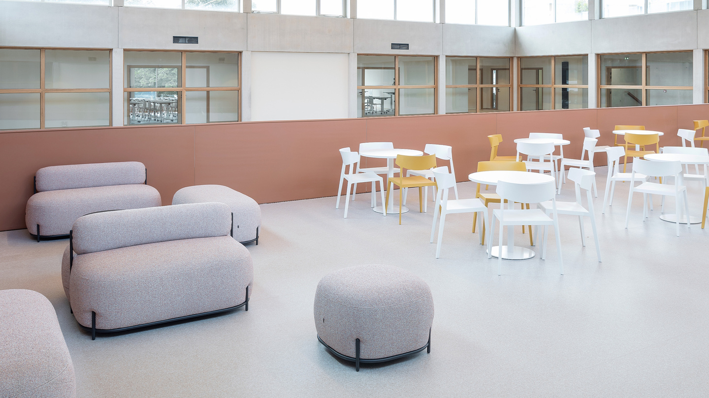 Pour favoriser la pédagogie active, permettre des configurations de travail en groupe, individuel et collaboratif, et favoriser les transitions rapides, des programmes comme les tables Talent 500, utilisées dans quatre salles pour créer des espaces modulaires pouvant servir à la fois de salles de classe, d'examen ou de réunion, ont été choisis. Dans la cafétéria, les sièges souples Globb, les chaises colorées Wing et les tables légères Tabula offrent différentes ambiances pour prendre un verre, se réunir ou simplement se reposer ; et dans le grand atrium d'accueil, les modules Bend, les tables hautes Tabula et les tabourets Noom 50 répondent à différents besoins et formes de relation.
