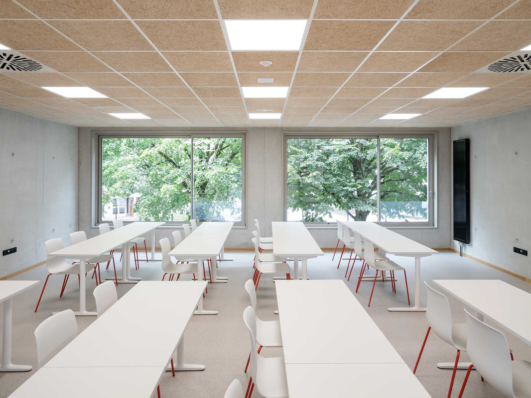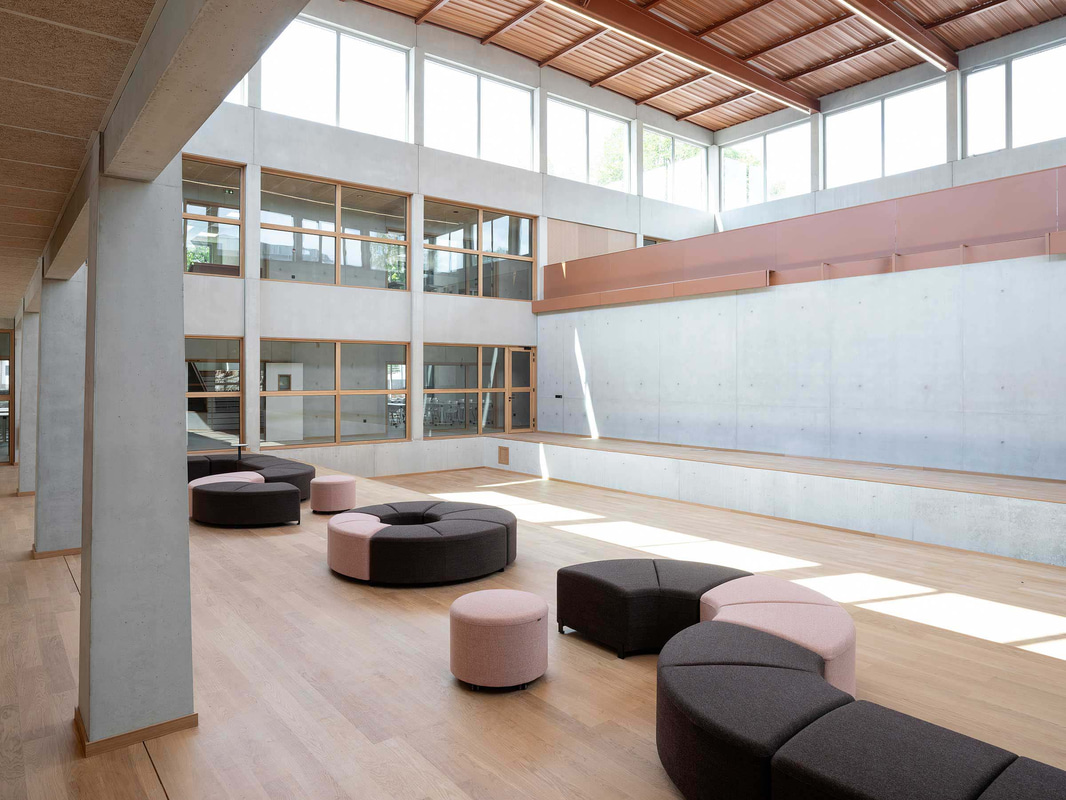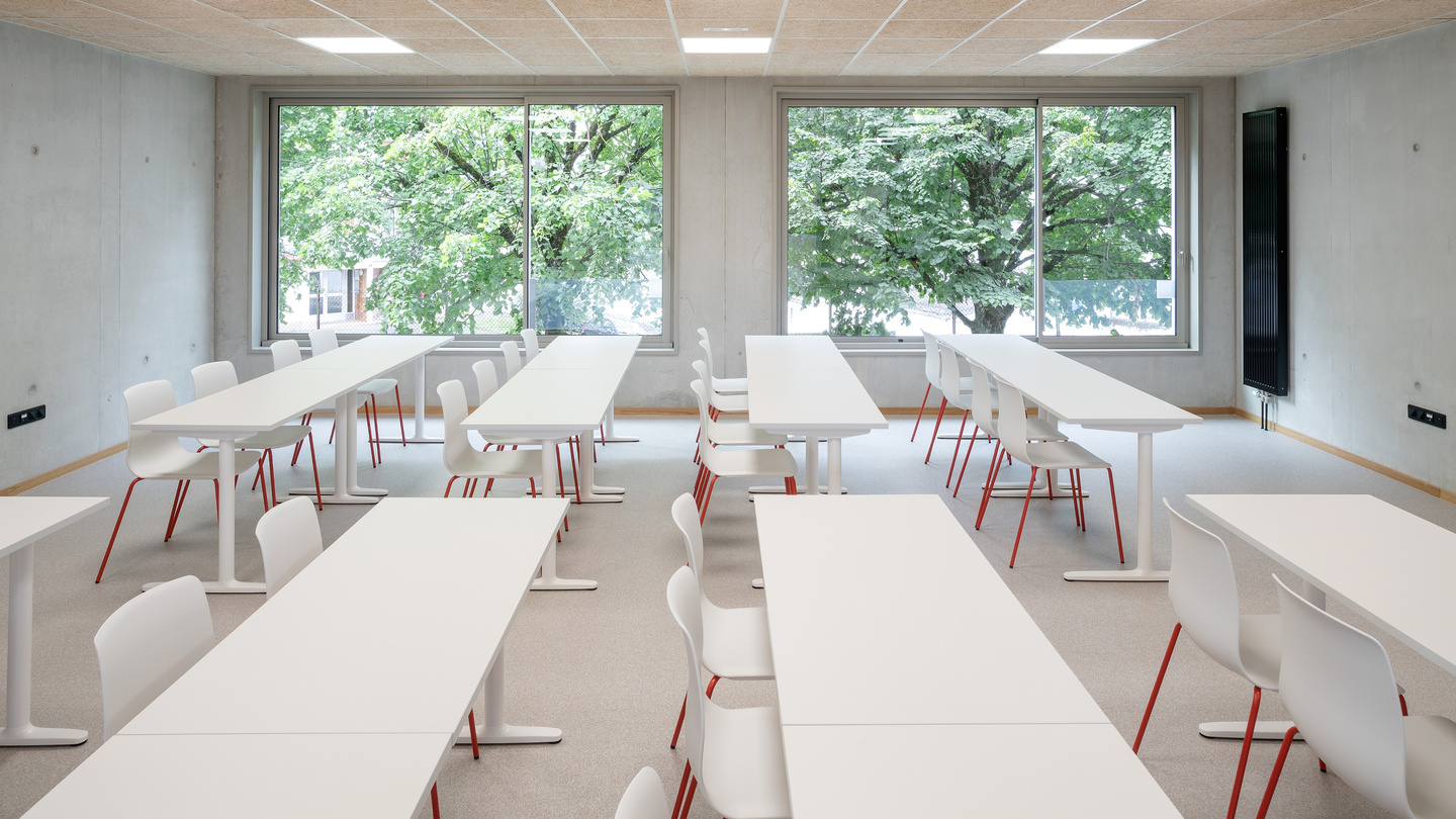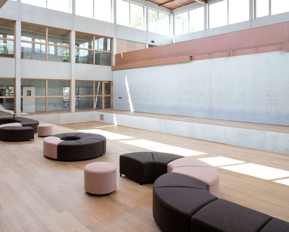 Pour favoriser la pédagogie active, permettre des configurations de travail en groupe, individuel et collaboratif, et favoriser les transitions rapides, des programmes comme les tables Talent 500, utilisées dans quatre salles pour créer des espaces modulaires pouvant servir à la fois de salles de classe, d'examen ou de réunion, ont été choisis. Dans la cafétéria, les sièges souples Globb, les chaises colorées Wing et les tables légères Tabula offrent différentes ambiances pour prendre un verre, se réunir ou simplement se reposer ; et dans le grand atrium d'accueil, les modules Bend, les tables hautes Tabula et les tabourets Noom 50 répondent à différents besoins et formes de relation.