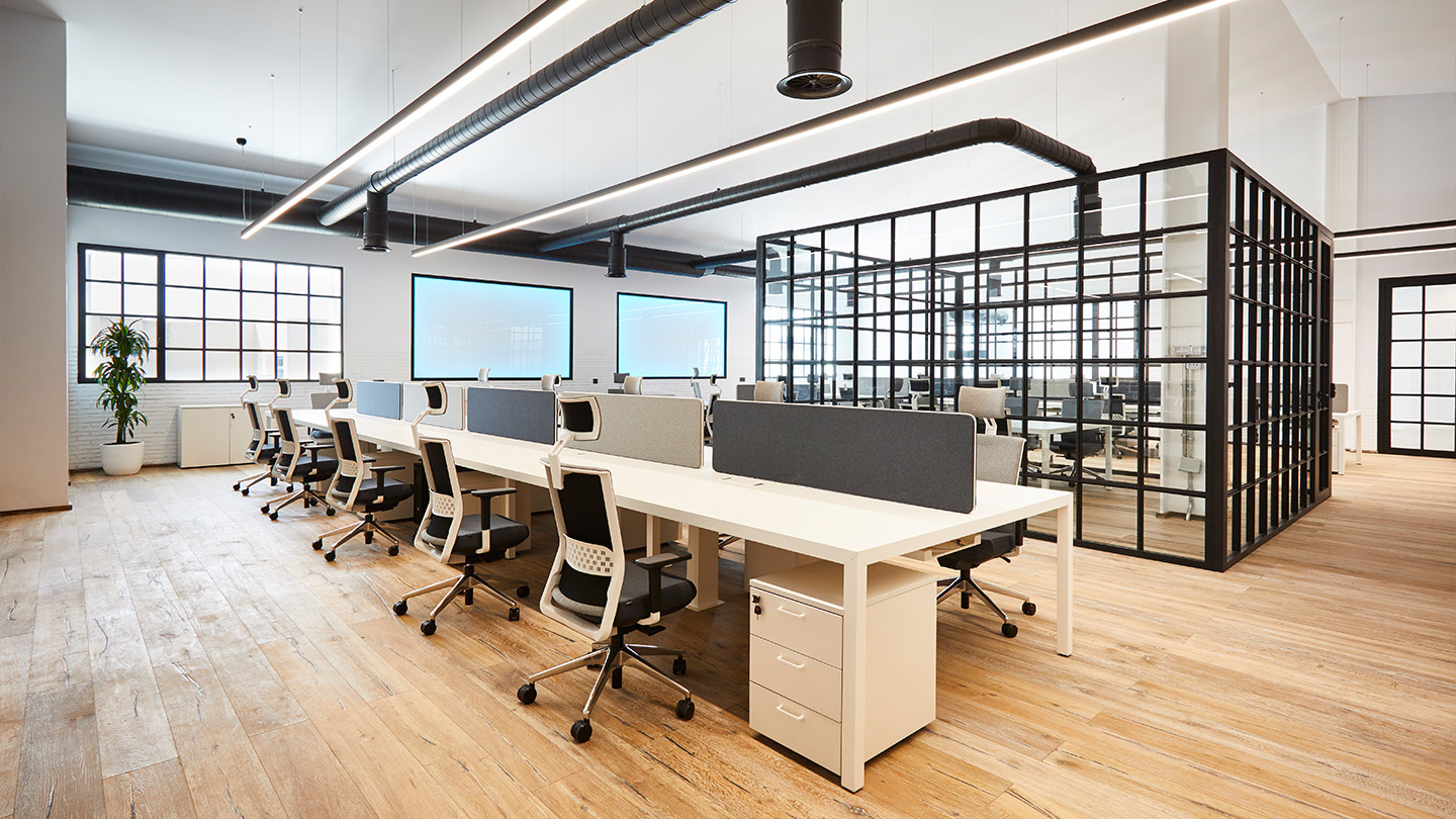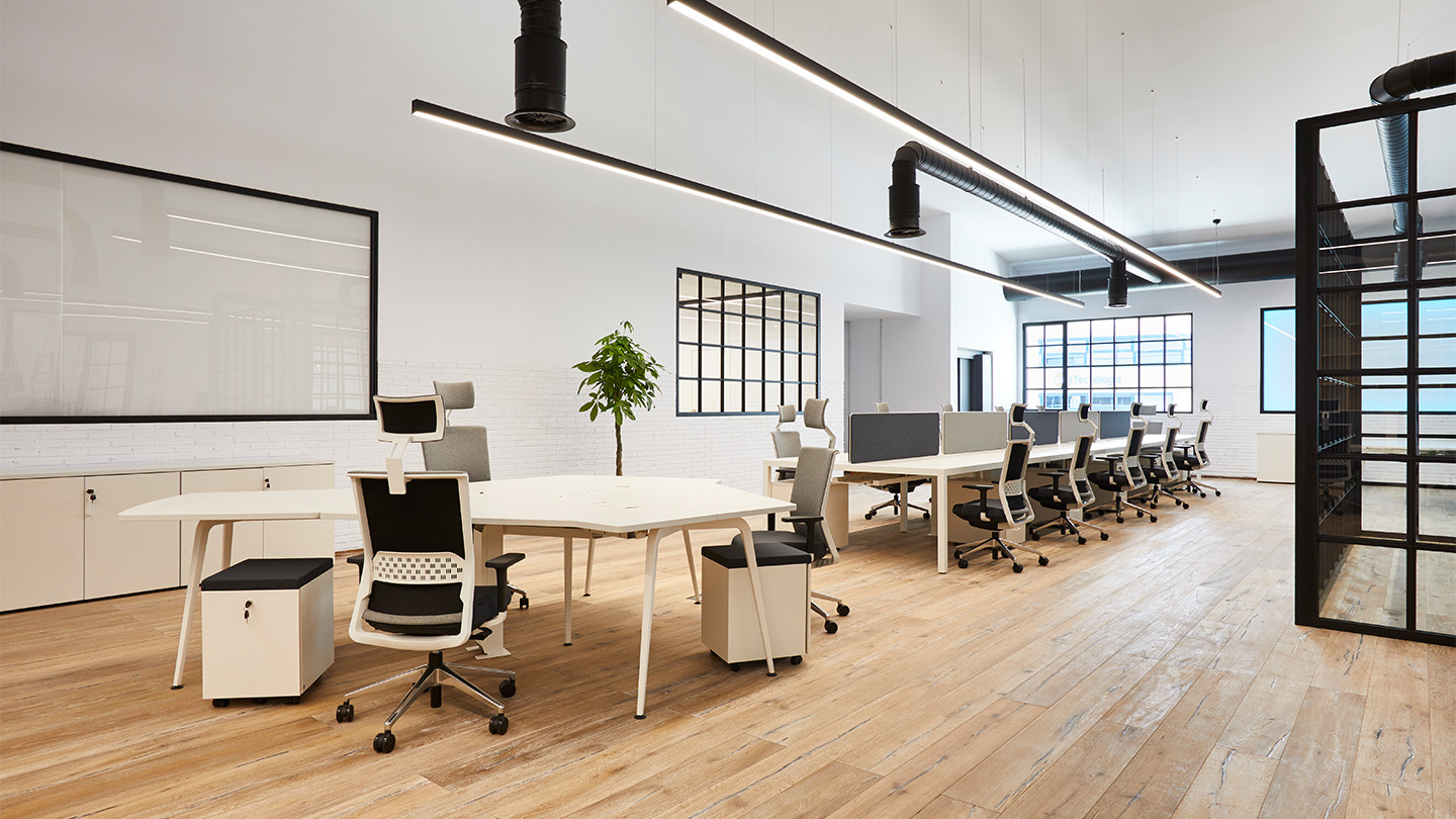 Sur un fond neutre de murs blancs, de planchers en bois, de luminaires apparents suspendus et de plans vitrés de style industriel, le nouveau siège combine des espaces ouverts et des zones compartimentées, ce qui permet une communication fluide.