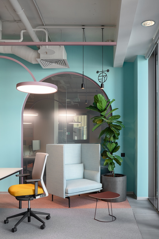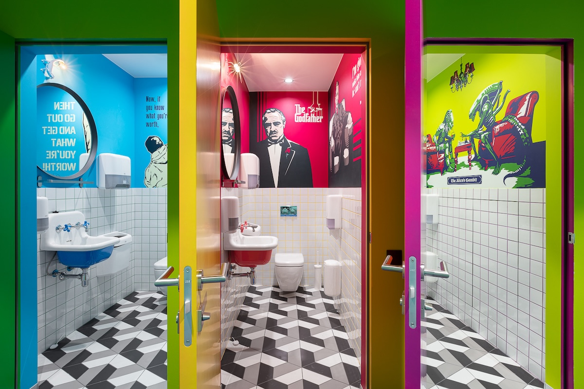 Pour renforcer cette atmosphère dynamique aux possibilités infinies, le projet d'ABD Architects combine une toile de fond douce et relaxante, dans des tons turquoise et rose pastel, avec des détails aux couleurs vives, des objets emblématiques des années 60 et 70, des graphiques frappants et des portraits de figures inspirantes telles que Steve Jobs et Bill Gates, Pelé, Arnold Schwarzenegger, Joseph Brodsky et Freddie Mercury.