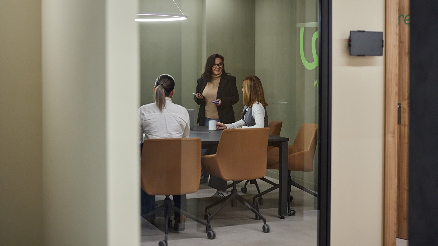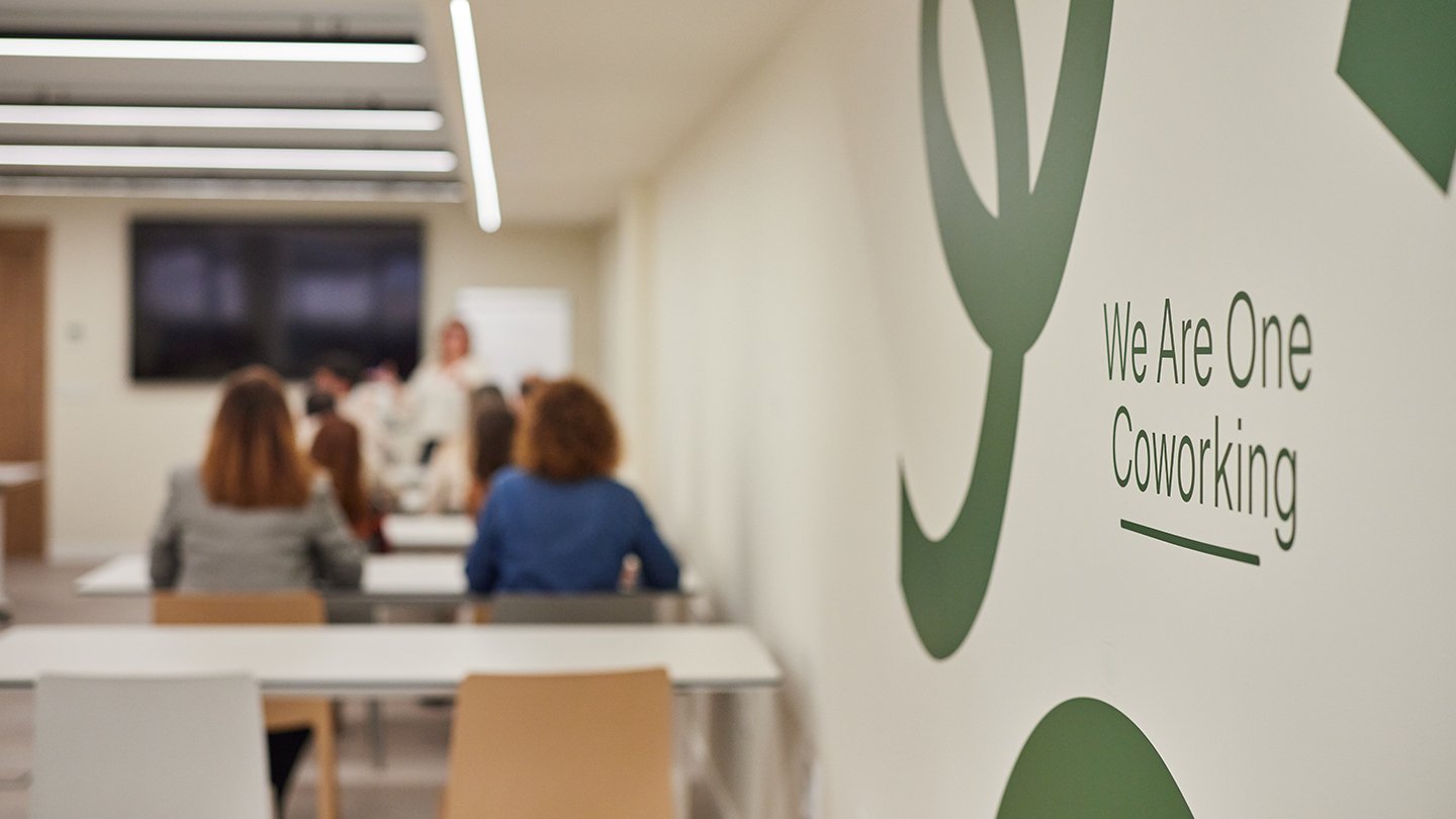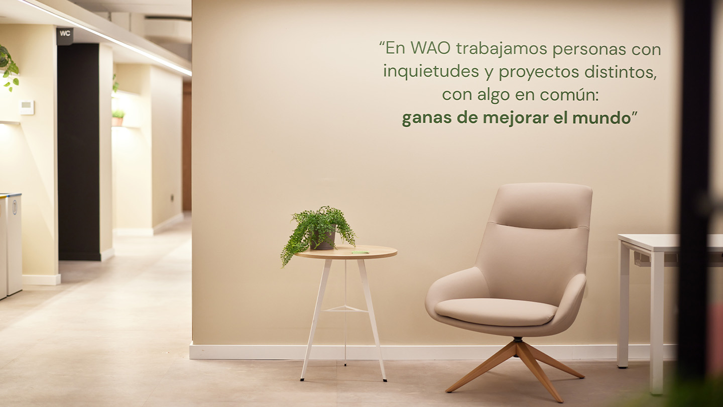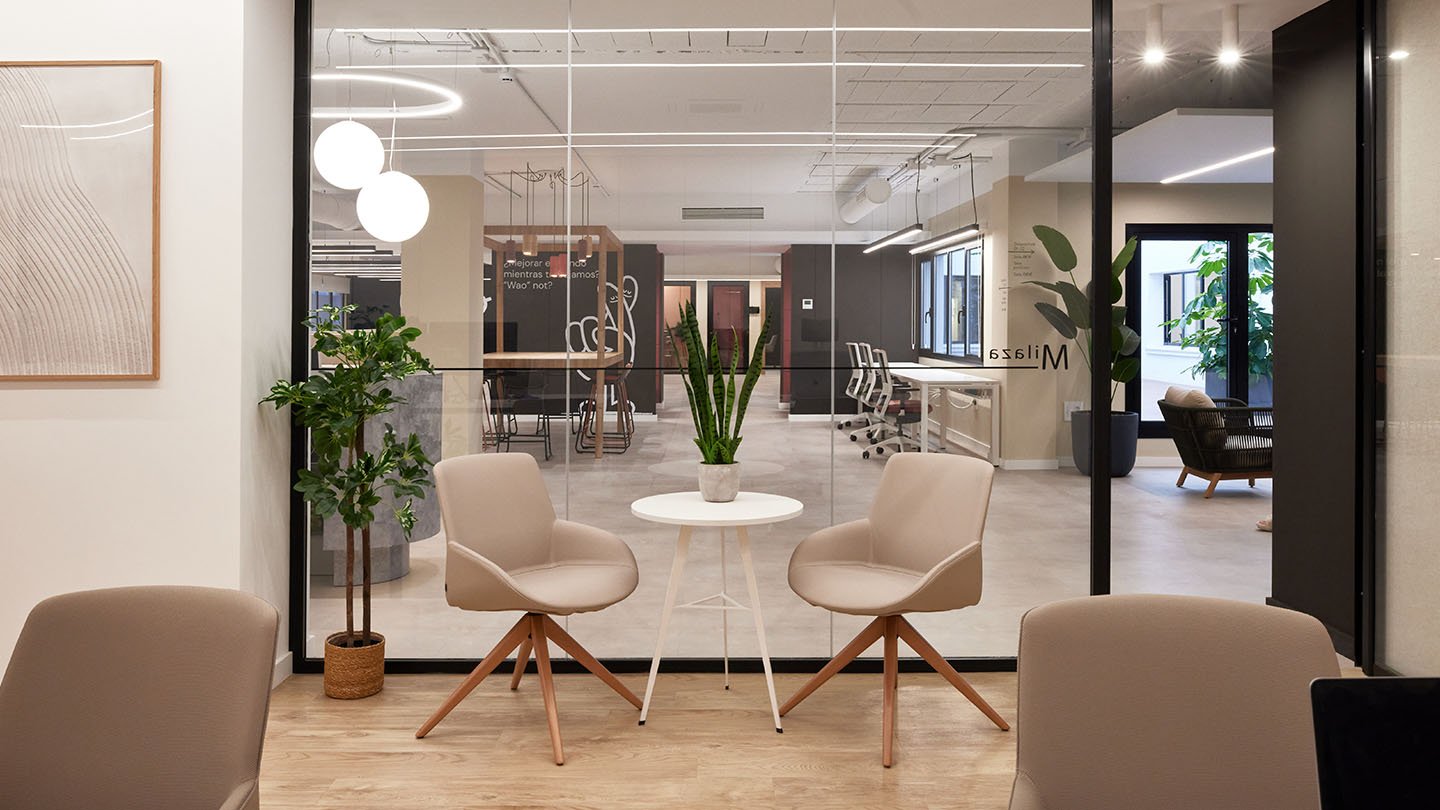 Après avoir supprimé les cloisons qui divisaient les anciens bureaux et n'avoir laissé que la structure, l'espace de coworking WAO est organisé sur un seul étage divisé en un grand espace ouvert, des bureaux privés spacieux situés autour de quatre cours intérieures qui laissent entrer la lumière naturelle et plusieurs salles -deux pour les réunions, une pour les podcasts et une autre, très polyvalente, pour les réunions et la formation-. "Lorsque l'agencement fonctionne, il est très facile de faire fonctionner le reste", explique María Andes, qui insiste sur l'importance du zonage et de l'équilibre des zones, en laissant des espaces de passage pour qu'il n'y ait pas de frictions entre les différents usages.