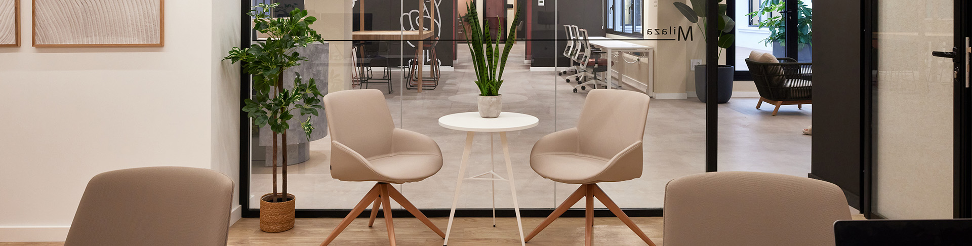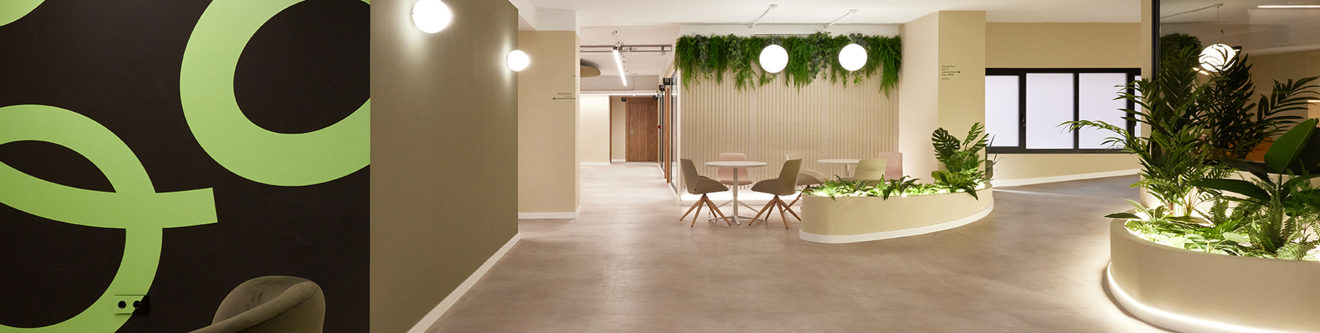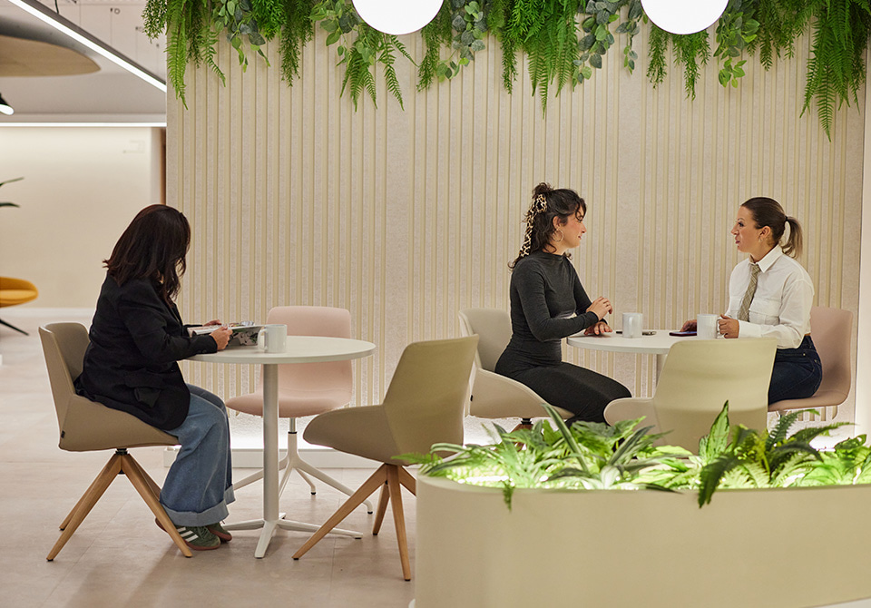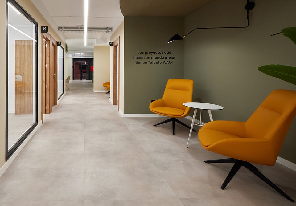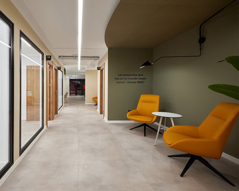 "J'ai choisi le mobilier d'Actiu pour sa garantie d'ergonomie et de repositionnement, ainsi que pour la composition de couleurs que sa tapisserie permettait, qui est organique et s'intègre à la peinture beige chaude des locaux", ajoute l'architecte d'intérieur María Andes. La tapisserie a été choisie dans un ton grillé, pas trop clair pour qu'elle puisse résister à la saleté, et la couleur la plus foncée est un chaudron assez doux. Dans la grande salle de coworking, le blanc des tables renforce la réflexion de la lumière et la luminosité, et le chêne est utilisé dans les bureaux. La biophilie est également présente, à travers la cour paysagée à l'entrée et les plantes artificielles qui intègrent la verdure dans tous les espaces.