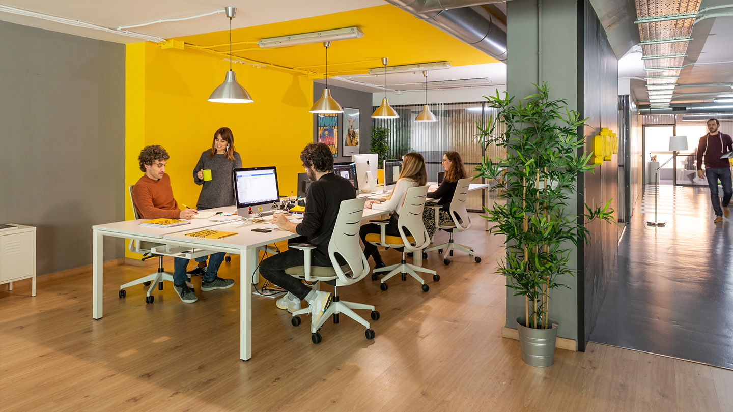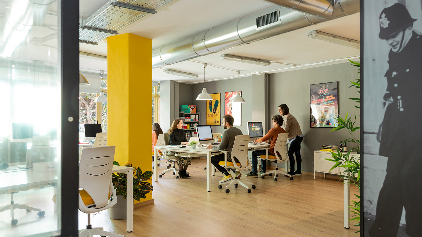 La couleur jaune et quelques touches de plantes vertes délimitent un grand espace ouvert et diaphane, où un mobilier polyvalent, flexible et modulable permet à ses travailleurs de se déplacer et de rejoindre temporairement des équipes. Planificateurs, designers, créatifs et chargés de clientèle travaillent main dans la main, aussi bien autour des tables Vital Plus et des chaises Efit des postes opérationnels de l'open space, que dans la salle de réunion équipée de chaises Wing et d'une table Vital Plus.