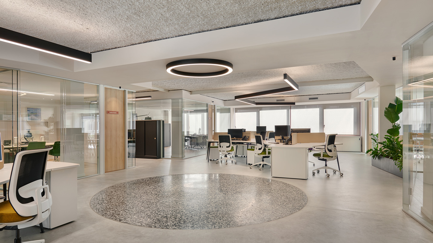 Sans réception ni service à la clientèle, l'entrée est utilisée pour générer un espace commun où se trouve la cuisine et une zone de repos/salle à manger rappelant une forêt, avec des espèces aromatiques qui favorisent le bien-être et la connexion avec l'environnement naturel. À côté de la forêt émerge la place centrale, avec un dallage continu en terrazzo qui concentre l'espace de travail. Un "bureau forum" autour duquel sont distribués les différents espaces de travail, comme des bâtiments donnant sur la place, avec des sols en PVC à haute résistance imitant le bois et des cloisons en verre qui garantissent une transparence maximale.