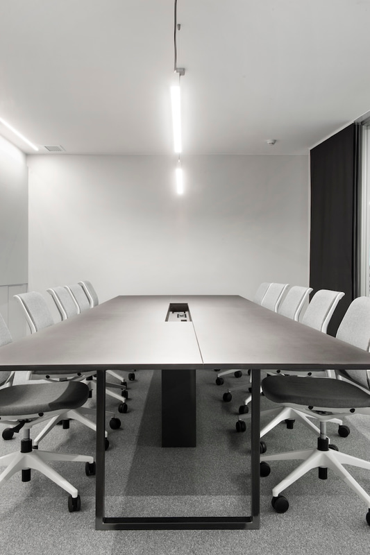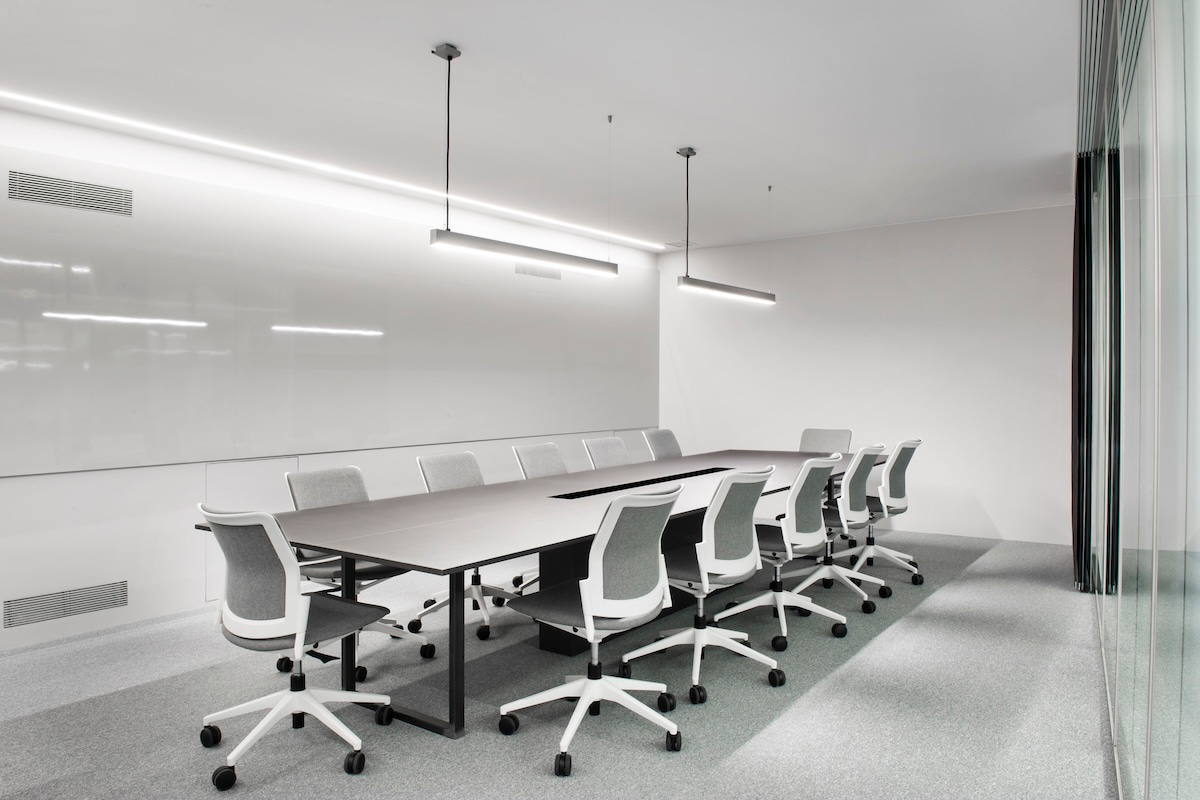 Pour les salles de réunion, des chaises Urban ont été choisies, sans accoudoirs, avec un piètement à cinq branches sur roulettes et revêtues dans la même gamme chromatique que celle qui colore l'ensemble du projet. Un "full colour" en gris avec un grand nombre de textures et de nuances, parmi lesquelles se distingue le produit phare de l'entreprise : les pièces rouges des pelles d'excavateur.