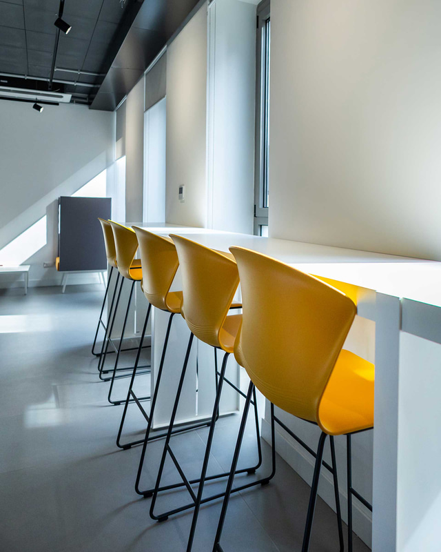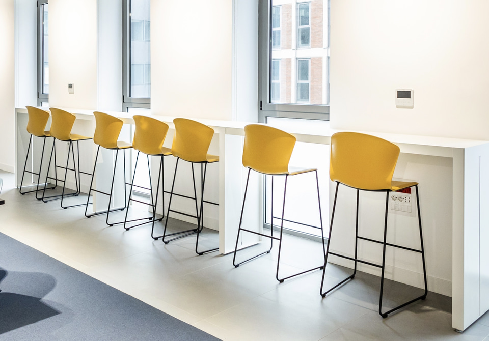 Les postes opérationnels, séparés pour des raisons organisationnelles et acoustiques, permettent une collaboration constante, tandis que les modules fermés sont destinés à des activités spécifiques. Le mobilier, fidèle aux principes d’économie durable, comprend des tables Prisma avec caissons Bucks, des chaises Trim et des banquettes Bend. Des tables réglables en hauteur et des tabourets favorisant une posture correcte et réduisant la sédentarité ont également été intégrés, augmentant la productivité et la performance au travail.