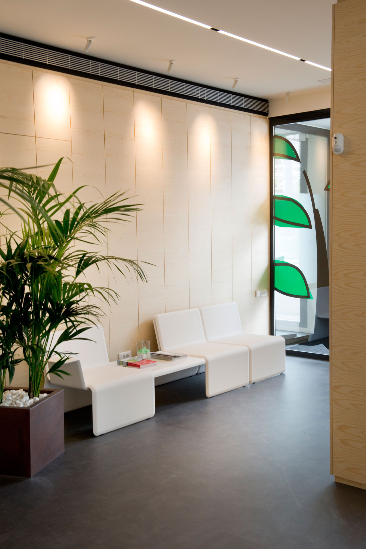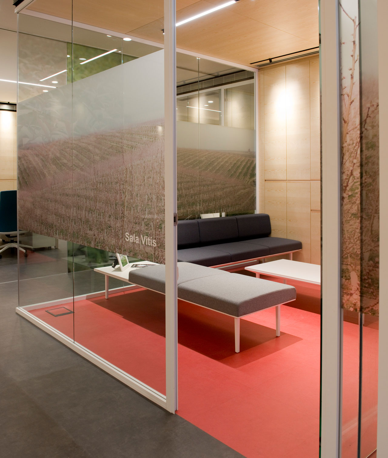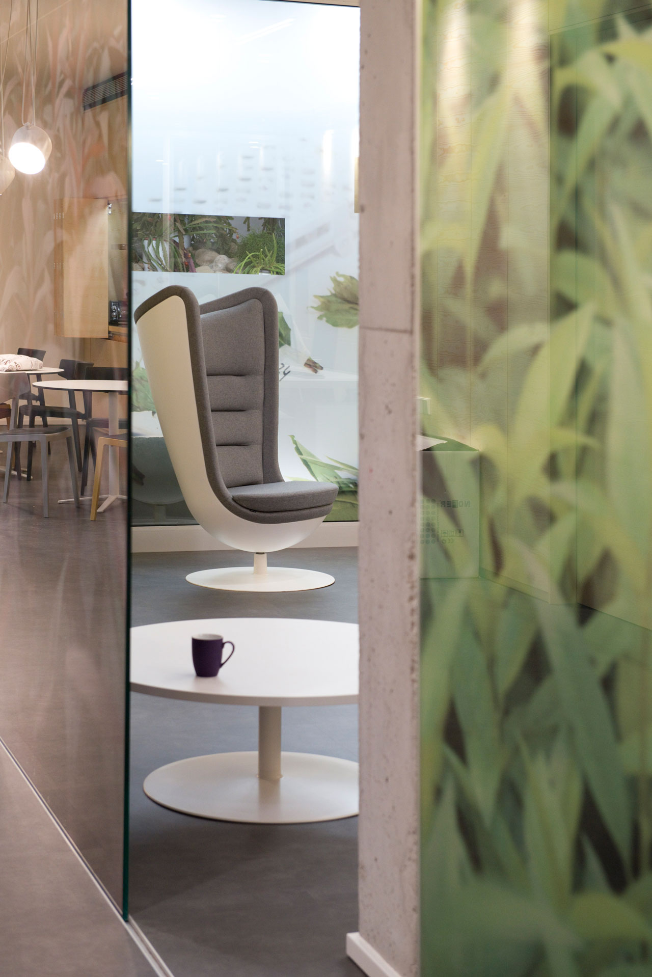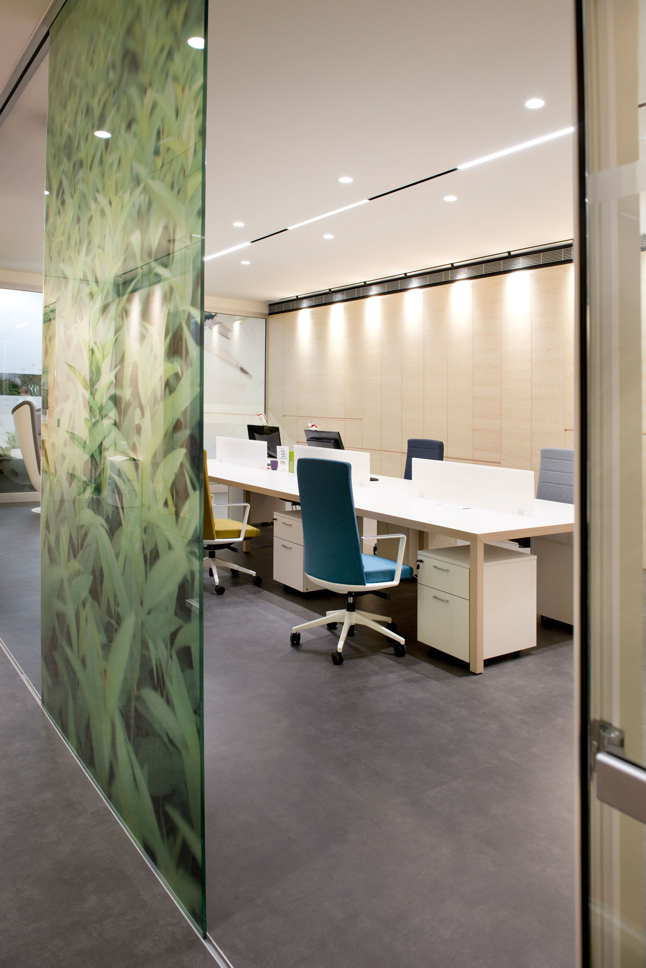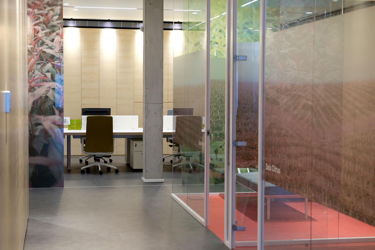 L’identité de marque et la proximité avec la nature se transmettent à partir de la conception graphique appliquée à l’espace et à partir du mobilier. Le verre occupe un rôle essentiel qui permet la vision le long des bureaux. Des vinyles aux motifs végétaux évoquent l’essence de la marque et forment un séduisant verger qui tamise l’entrée avec une lumière naturelle, tout en offrant une solution à la visibilité des espaces intérieurs.