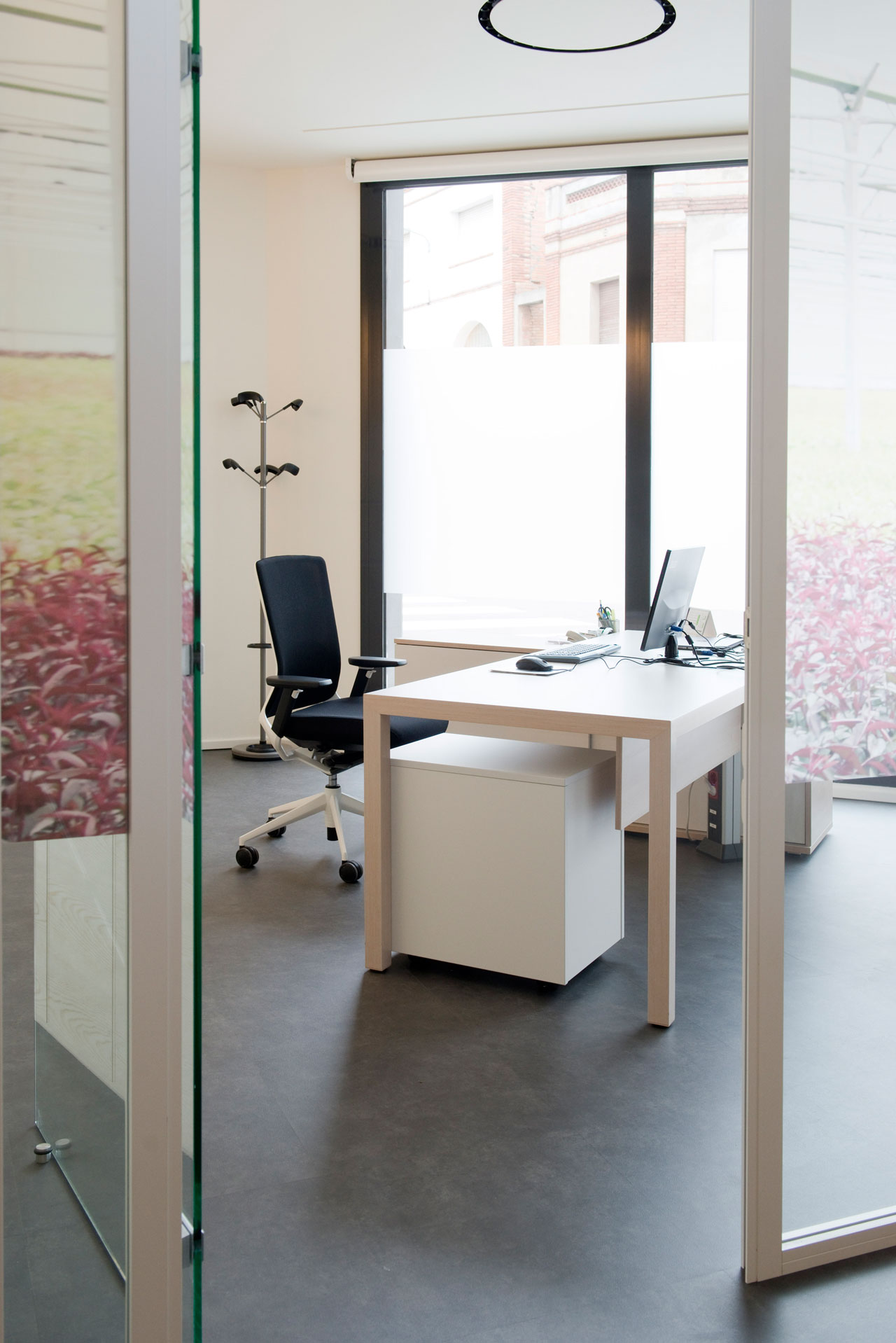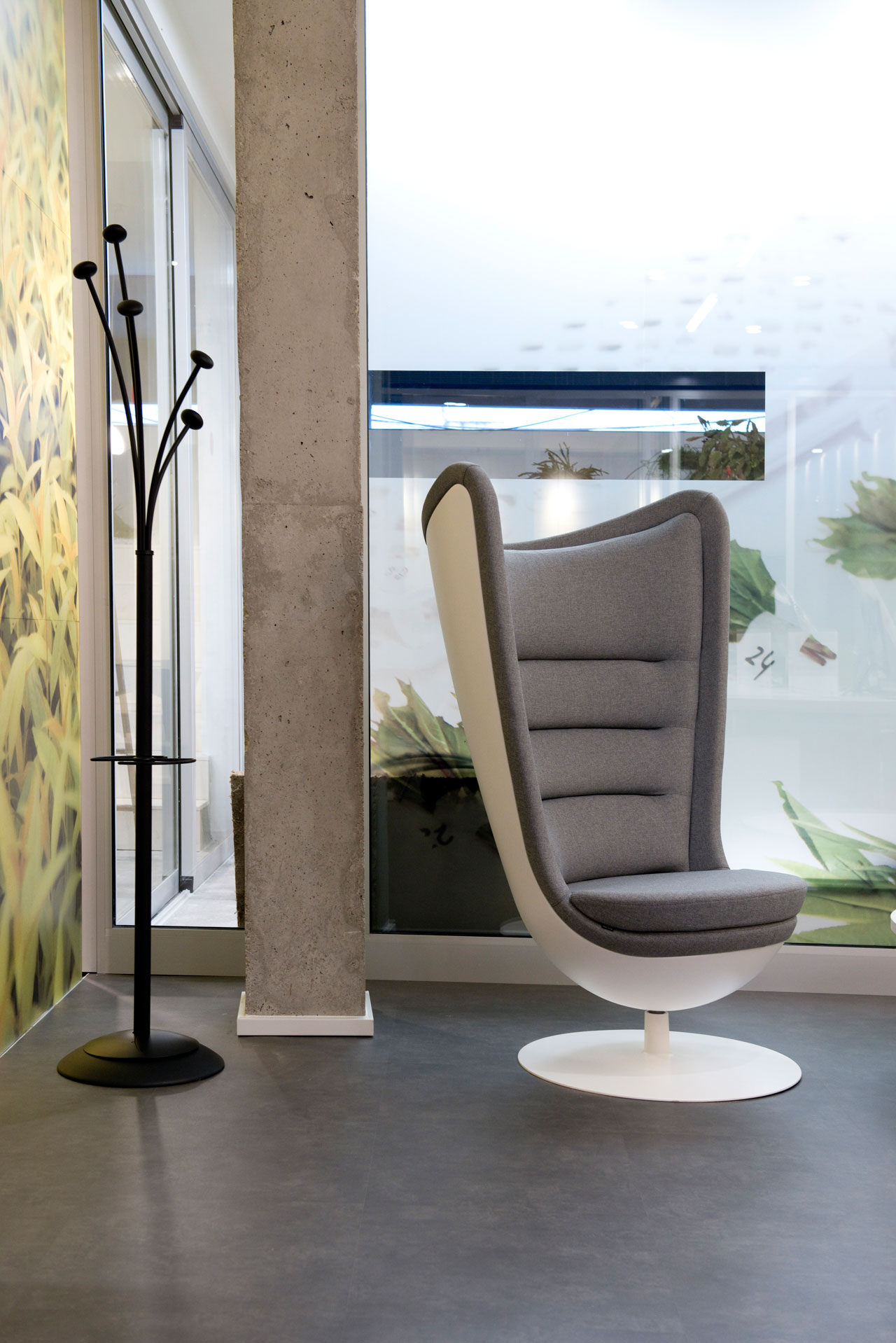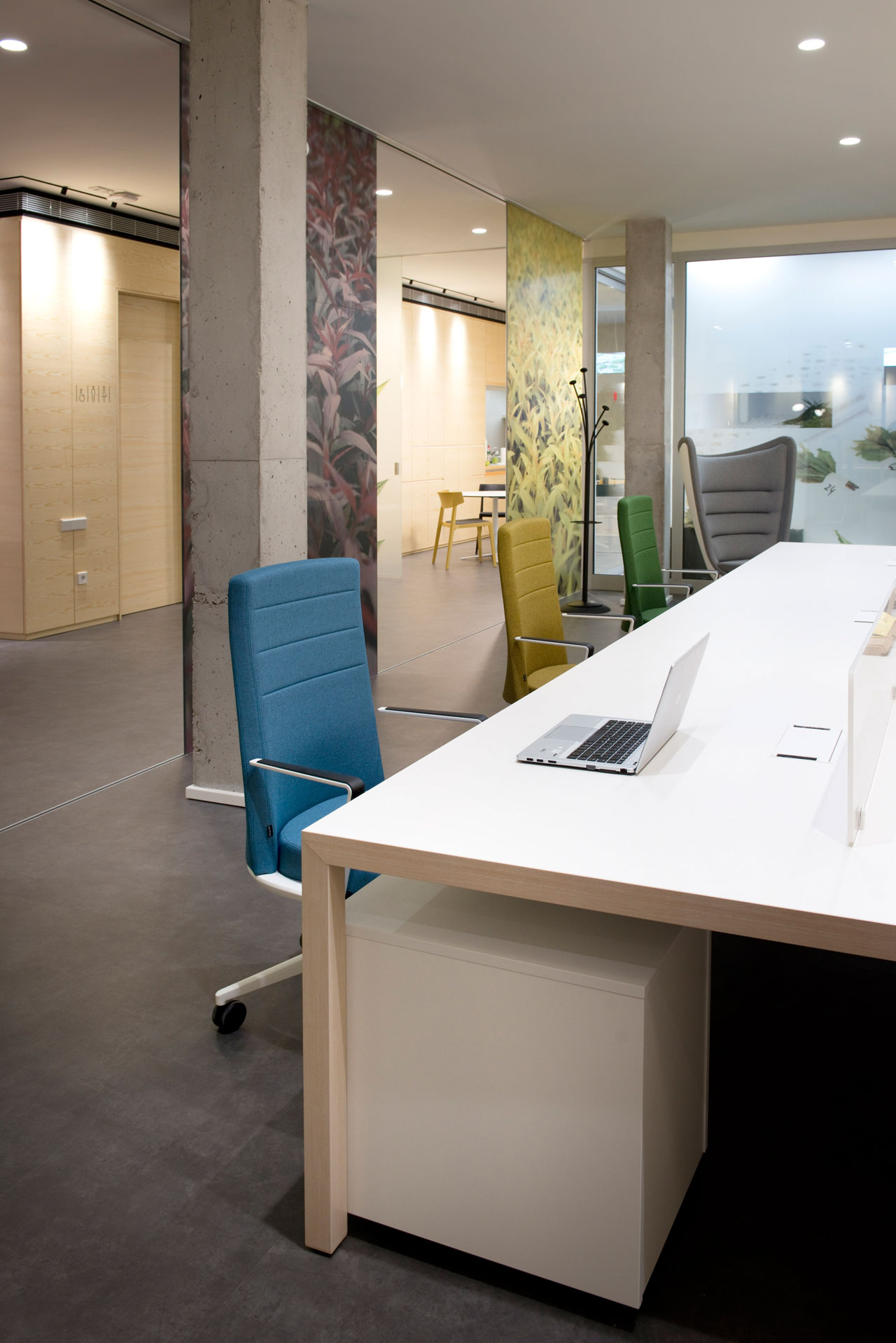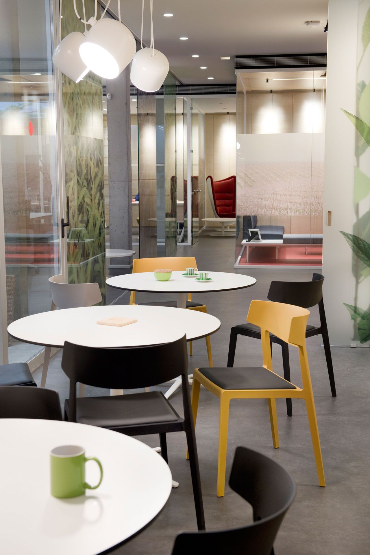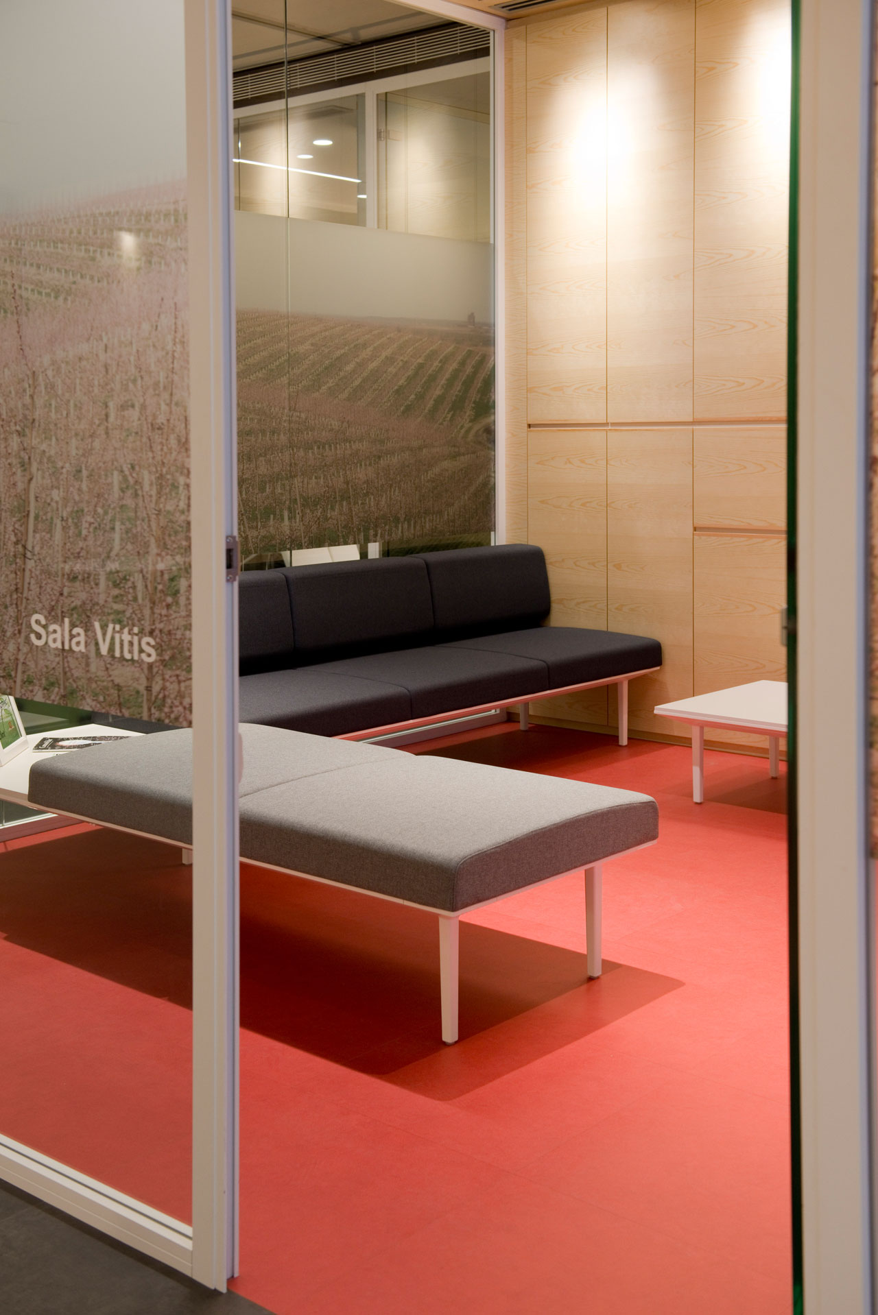 L’identité de marque et la proximité avec la nature se transmettent à partir de la conception graphique appliquée à l’espace et à partir du mobilier. Le verre occupe un rôle essentiel qui permet la vision le long des bureaux. Des vinyles aux motifs végétaux évoquent l’essence de la marque et forment un séduisant verger qui tamise l’entrée avec une lumière naturelle, tout en offrant une solution à la visibilité des espaces intérieurs.
