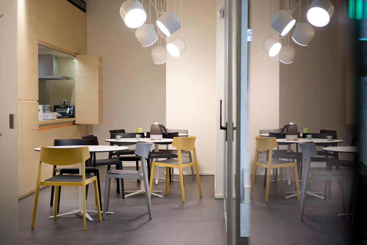 La cuisine, qui représente un autre espace clé dans tous les bureaux, s’équipe de sièges Wing et de tables Tabula, et se dédouble pour devenir à la fois une zone de repas et un espace informel de réunions, grâce à la conception d’armoires qui permettent son ouverture ou sa fermeture.