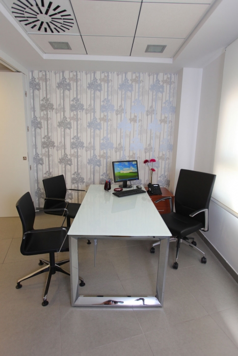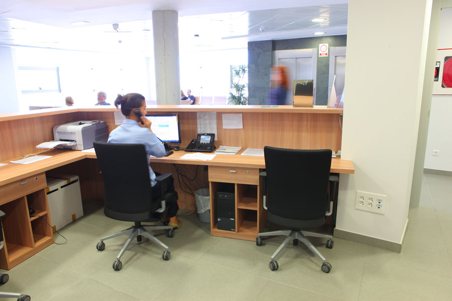 La gamme de produit de base sélectionné a été Vital Plus avec son large éventail de possibilités de configuration de table et son design et ses finitions très attrayantes. La superficie de travail est en verre de sécurité translucide et la structure varie selon l'utilisation. Nous trouvons des cadres fermés ou à quatre pieds. Certaines salles de consultation sont équipées de table à retour et d'autres de table individuelle.